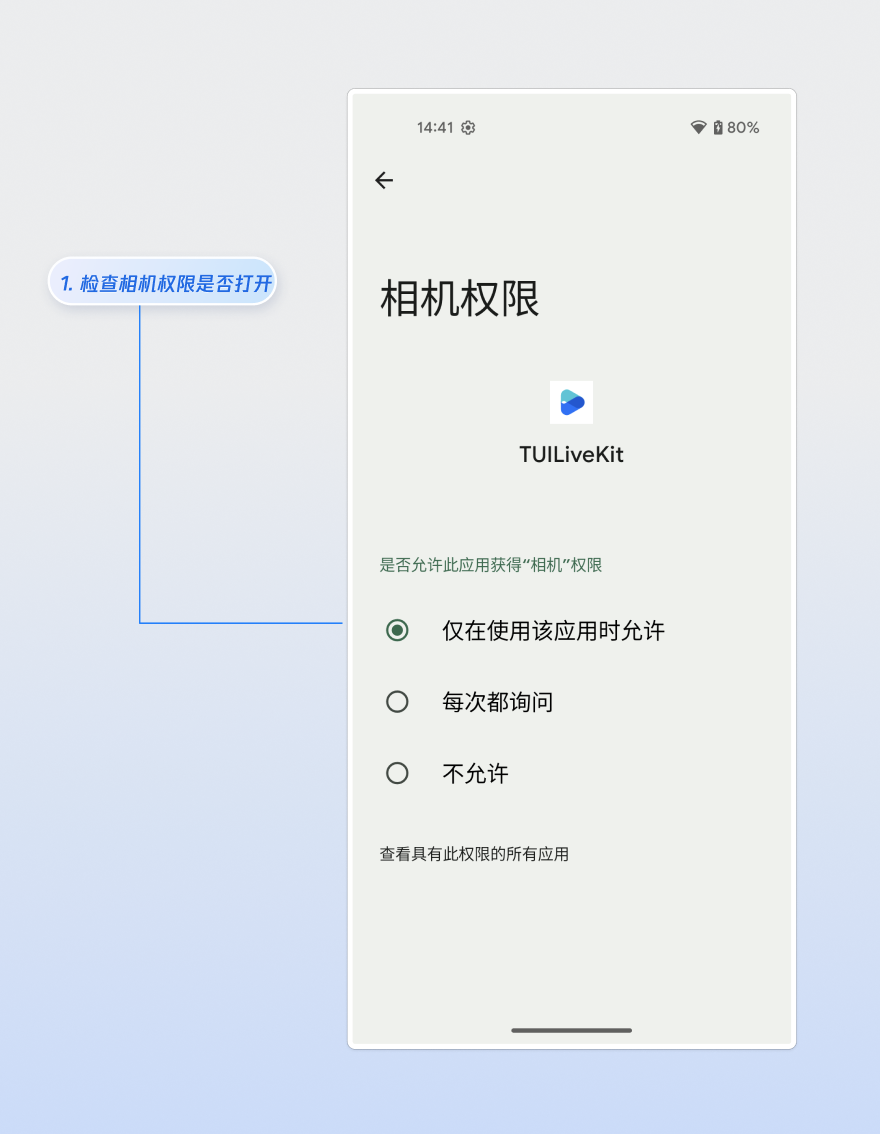 请前往应用信息 > 权限 > 相机,检查摄像头权限是否开启,可参考下图: