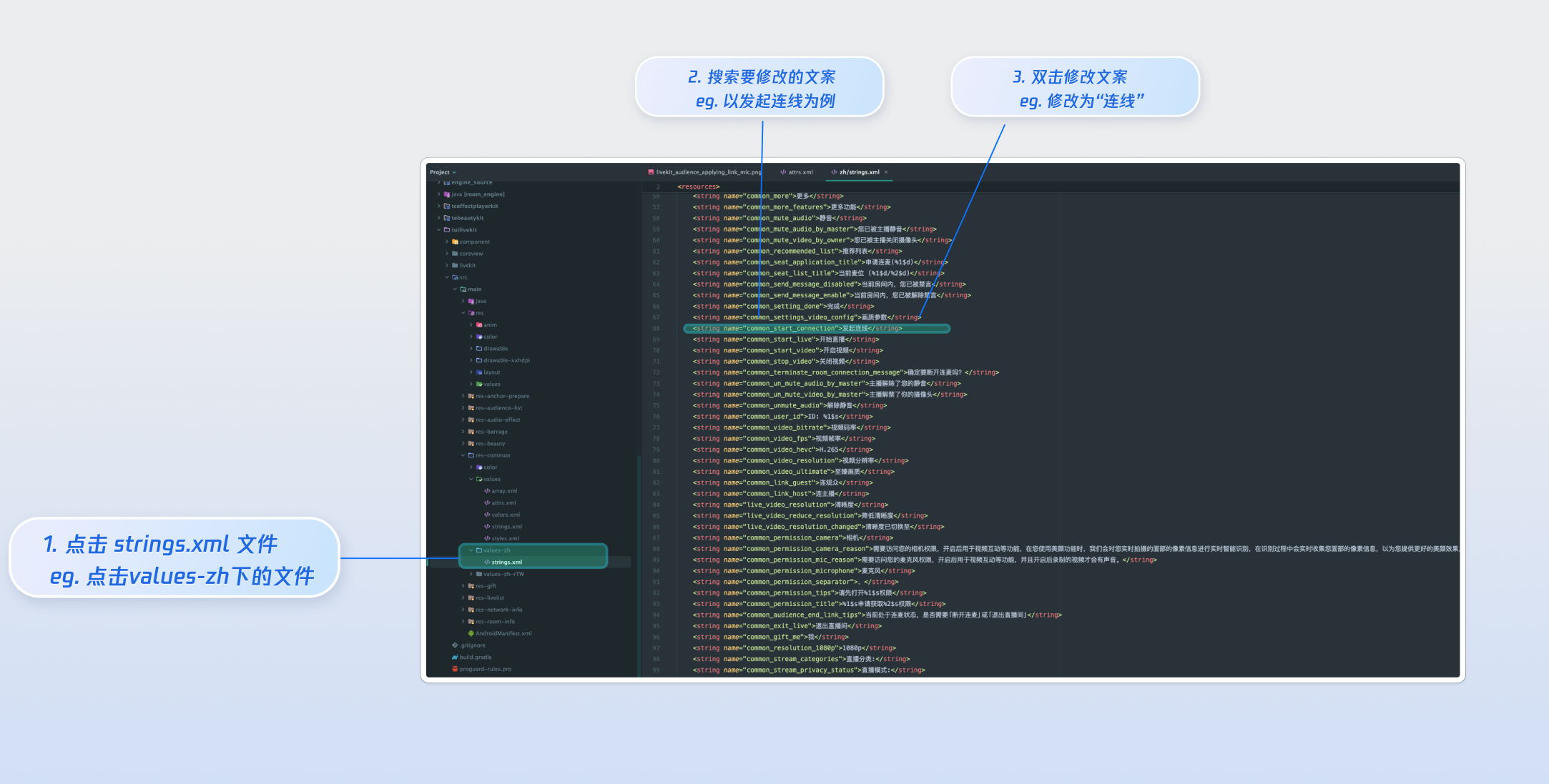 TUILiveKit 使用 Android 通用的 XML 资源文件来管理 UI 所需的文案显示,您可以直接通过
