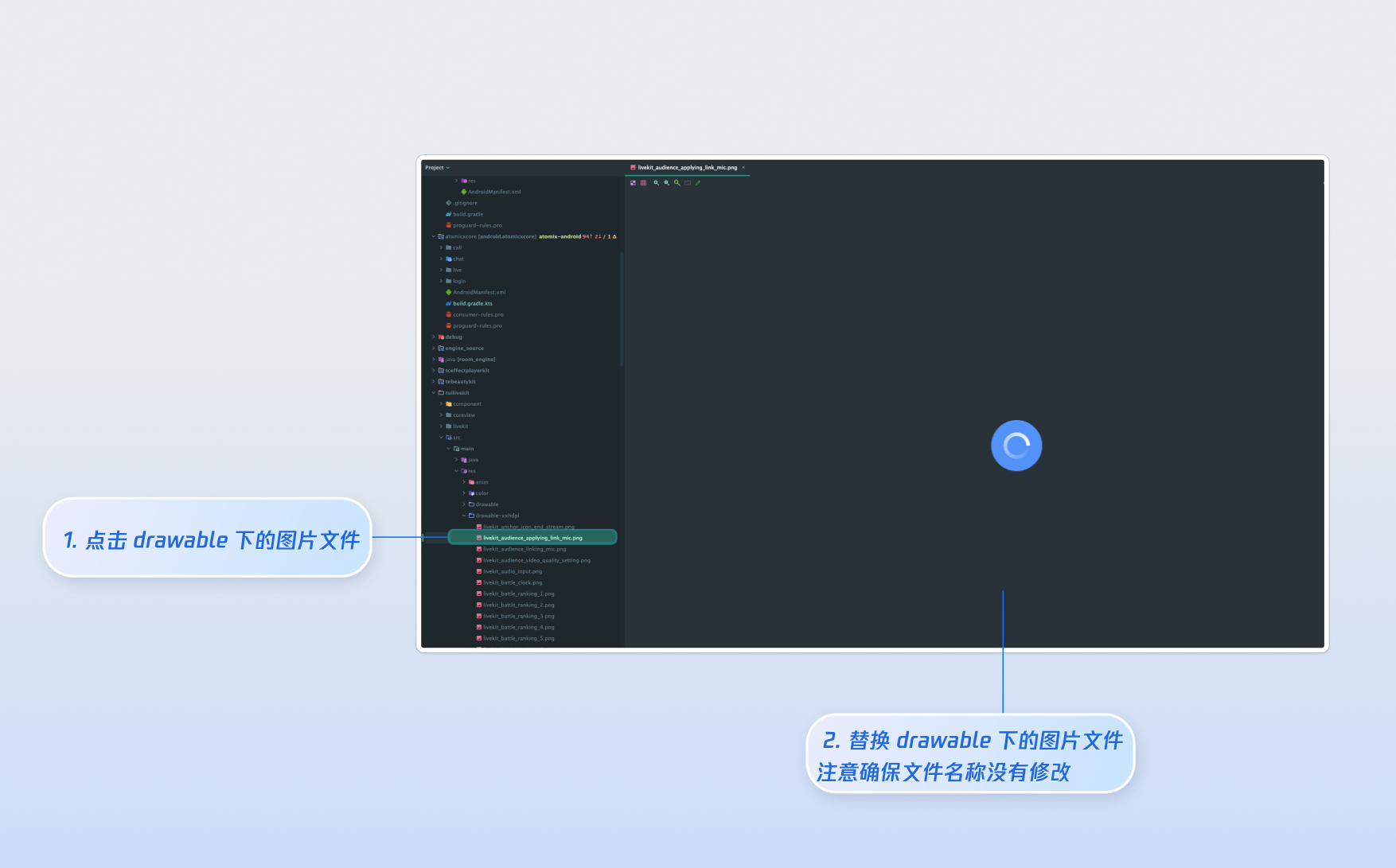 drawable 资源文件夹管理 UI 所需的图片资源,您可以通过替换资源文件快速修改自定义界面所需的图标,替换时请确保新的文件名称与原文件名称一致。