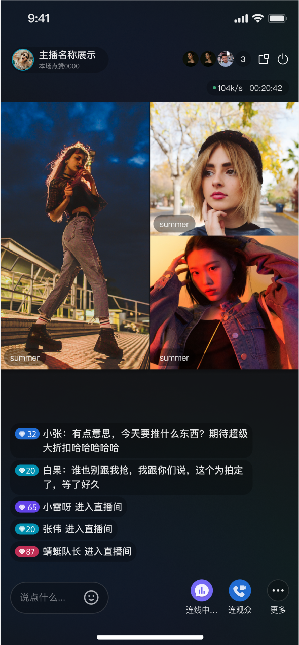 实现观众进入主播的直播间后观看直播,实现观众连麦 、直播间信息、在线观众、弹幕显示等功能