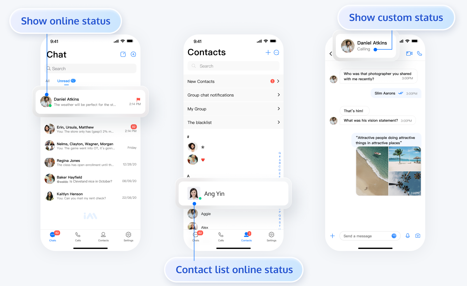 您可以使用本功能,在您的 App 中展示用户的在线状态及自定义状态,效果图如下所示: