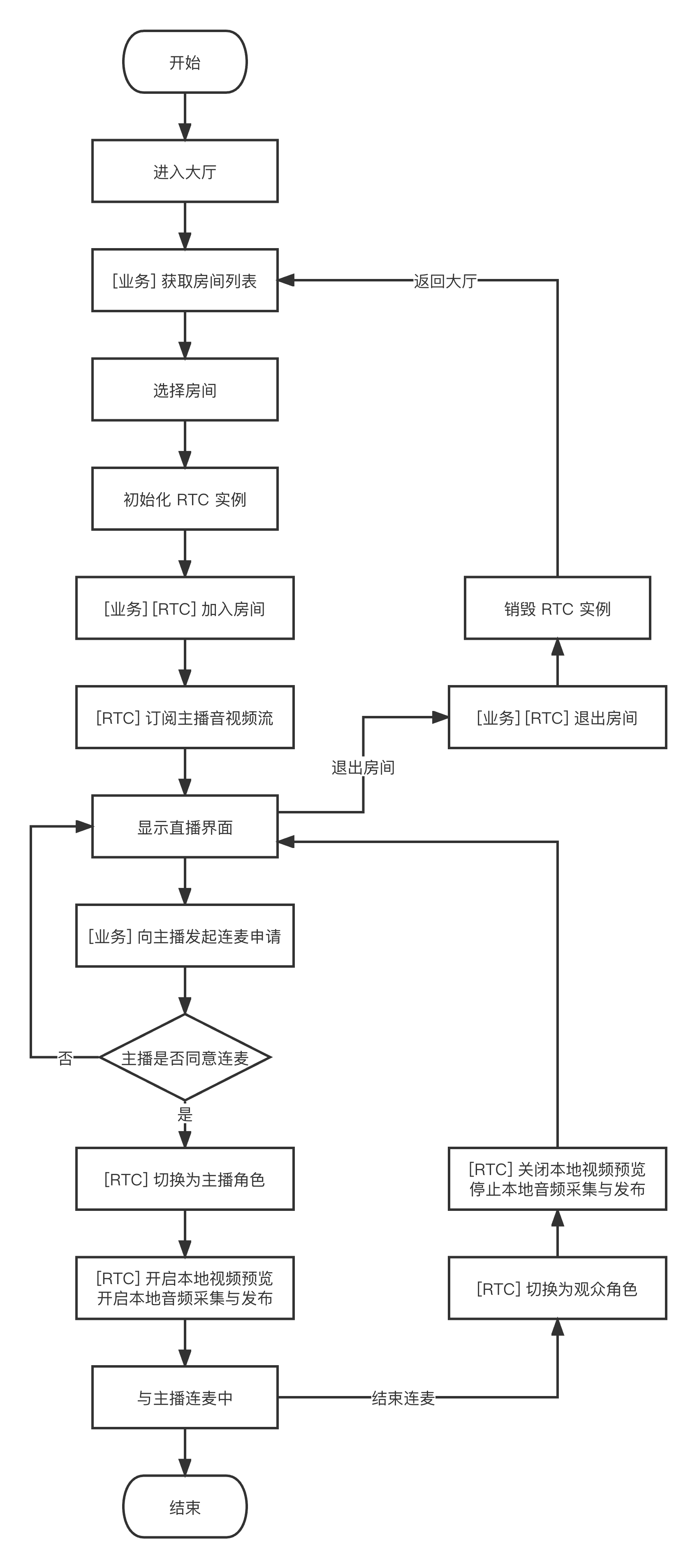 下图展示了 RTC 实时互动直播间观众进入房间、申请连麦、结束连麦、退出房间的流程。