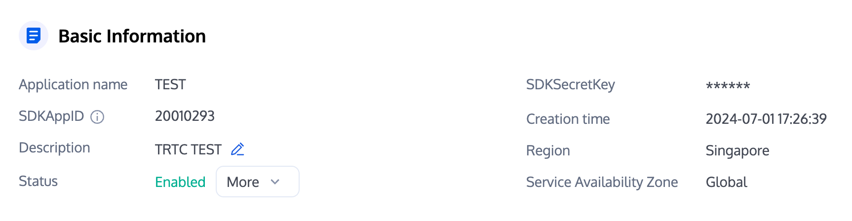 2. 应用创建完毕之后,您可以在应用管理-应用概览栏目看到该应用的基本信息,其中需要您保管好 SDKAppID、SDKSecretKey 便于后续使用,同时应避免密钥泄露造成流量盗刷。