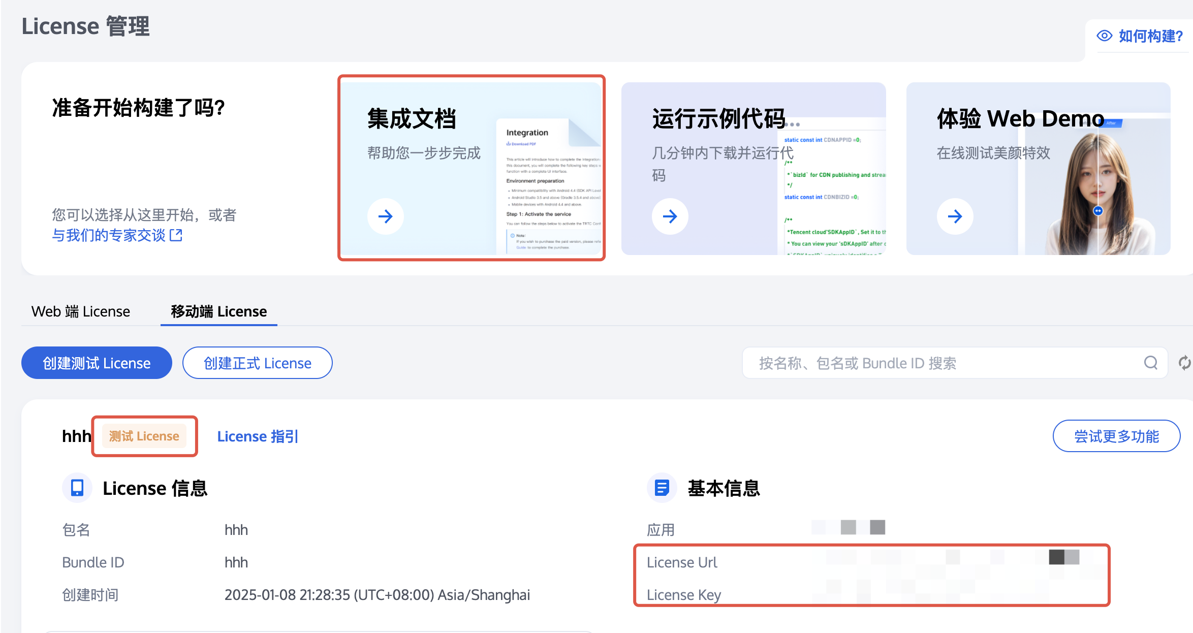 2. 激活后,您可以在当前页面查看您的信息,并参考上方集成指南进行集成。可在 集成指南 中查看 License Key 和 License URL 如何使用。