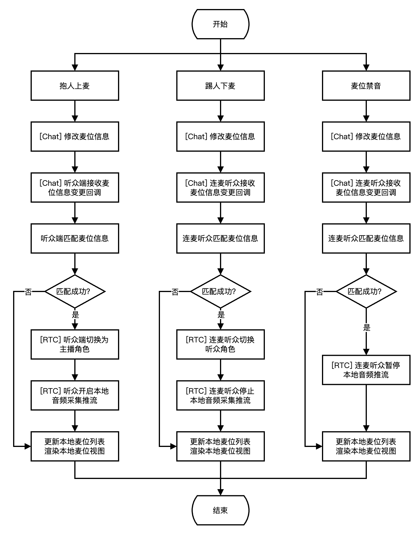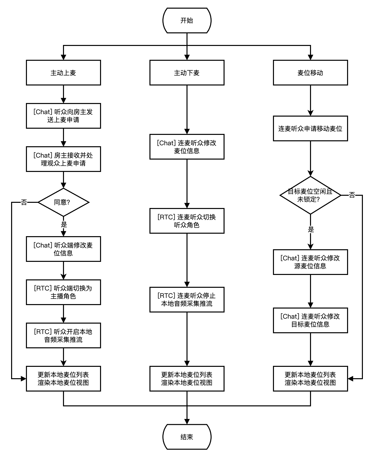下图展示了听众麦位管理流程,包含主动上麦、主动下麦、麦位移动的实现流程。