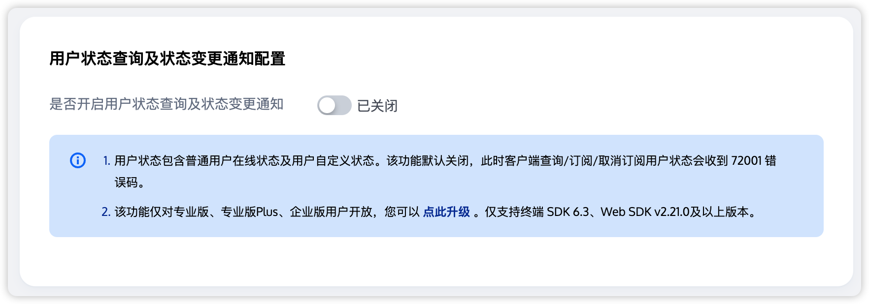 订阅用户状态需要提前在 Chat 控制台 开启 用户状态查询及状态变更通知配置,如果未开启则调用