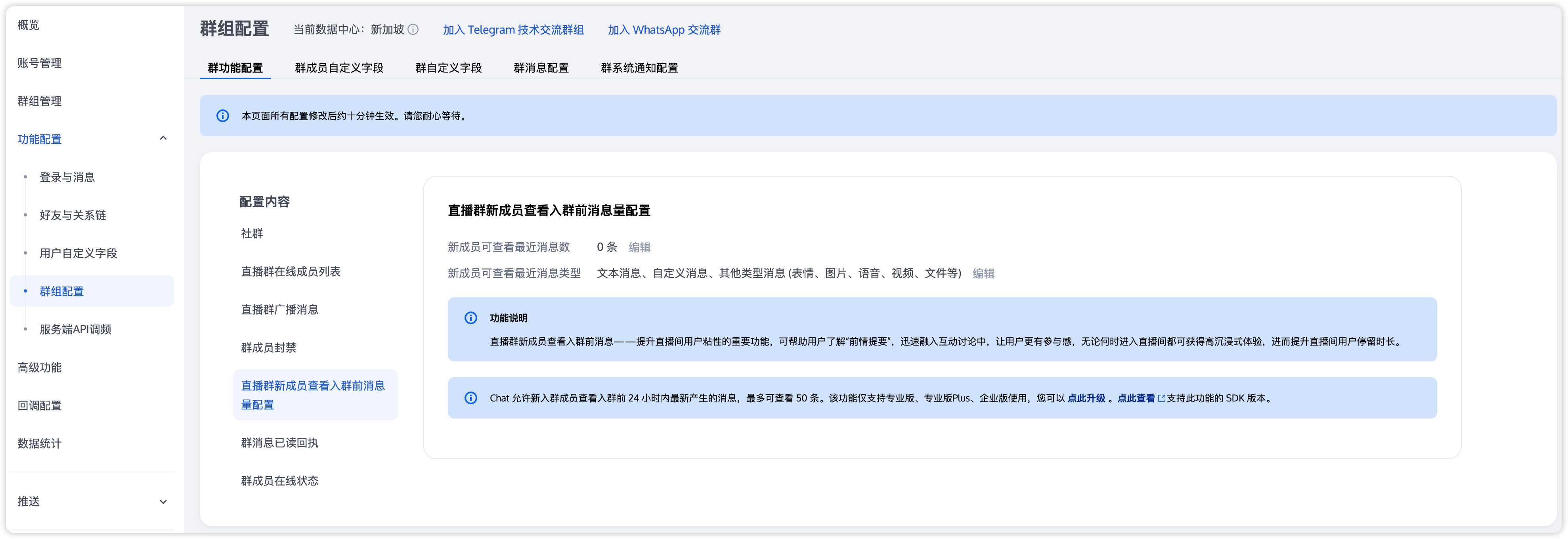 使用 AVChatRoom 默认不存储直播间历史消息,当新用户进入直播间后,只能看到进入直播间后用户发送的消息。为了优化新进群用户的体验,可在控制台配置直播群用户拉取进群前消息条数,如图: