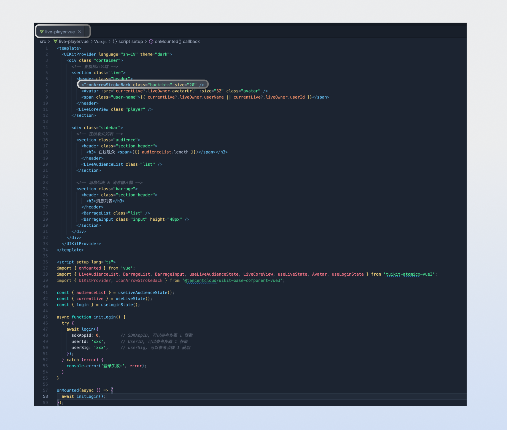 live-player.vue 文件,可直接复制如下代码至您的项目中集成观看页面。<template><UIKitProvider language="zh-CN" theme="dark"><div class="container"><!-- 直播核心区域 --><section class="live"><header class="header"><IconArrowStrokeBack class="back-btn" size="20" /><Avatar :src="currentLive?.liveOwner.avatarUrl" :size="32" class="avatar" /><span class="user-name">{{ currentLive?.liveOwner.userName || currentLive?.liveOwner.userId }}</span></header><LiveCoreView class="player" /></section><div class="sidebar"><!-- 在线观众列表 --><section class="audience"><header class="section-header"><h3> 在线观众 <span>({{ audienceList.length }})</span></h3></header><LiveAudienceList class="list" /></section><!-- 消息列表 & 消息输入框 --><section class="barrage"><header class="section-header"><h3>消息列表</h3></header><BarrageList class="list" /><BarrageInput class="input" height="48px" /></section></div></div></UIKitProvider></template><script setup lang="ts">import { LiveAudienceList, BarrageList, BarrageInput, useLiveAudienceState, LiveCoreView, useLiveState, Avatar, useLoginState } from 'tuikit-atomicx-vue3';import { UIKitProvider, IconArrowStrokeBack } from '@tencentcloud/uikit-base-component-vue3';const { audienceList } = useLiveAudienceState();const { currentLive } = useLiveState();const { login } = useLoginState();async function initLogin() {try {await login({sdkAppId: 0, // SDKAppID, 可以参考步骤 1 获取userId: 'xxx', // UserID, 可以参考步骤 1 获取userSig: 'xxx', // userSig, 可以参考步骤 1 获取});} catch (error) {console.error('登录失败:', error);}}onMounted(async () => {await initLogin();});</script><style>:global(body){height:100vh;width:100vw;margin:0;padding:0;overflow:hidden;font-size:15px;line-height:1.6;text-rendering:optimizeLegibility;}:global(*),:global(*::before),:global(*::after){box-sizing:border-box;margin:0;}.container{display:grid;grid-template-columns:70% 30%;height:100vh;width:100vw;gap:16px;padding:16px;background:var(--bg-color-default);box-sizing:border-box;overflow:hidden;}.live{display:flex;flex-direction:column;background:var(--bg-color-operate);border-radius:12px;overflow:hidden;box-shadow:0 2px 8px var(--shadow-color);}.header{display:flex;align-items:center;gap:12px;padding:16px;border-bottom:1px solid var(--stroke-color-primary);}.back-btn{cursor:pointer;color:var(--text-color-tertiary);transition:color 0.2s;}.back-btn:hover{color:var(--text-color-link-hover);}.avatar{border:1px solid var(--uikit-color-white-7);}.user-name{color:var(--text-color-primary);font-weight:500;}.player{flex:1;background:var(--uikit-color-black-1);}.sidebar{display:flex;flex-direction:column;gap:16px;height:100%;overflow:hidden;}.audience{display:flex;flex-direction:column;background:var(--bg-color-operate);border-radius:12px;overflow:hidden;box-shadow:0 2px 8px var(--shadow-color);flex:1;min-height:0;}.barrage{display:flex;flex-direction:column;background:var(--bg-color-operate);border-radius:12px;overflow:hidden;box-shadow:0 2px 8px var(--shadow-color);flex:1;min-height:0;}.section-header{padding:16px;border-bottom:1px solid var(--stroke-color-primary);background:var(--bg-color-operate);}.section-header h3{margin:0;font-size:16px;font-weight:600;color:var(--text-color-primary);}.section-header span{font-weight:400;color:var(--text-color-secondary);font-size:14px;}.list{flex:1;min-height:0;overflow-y:auto;}.input{border-top:1px solid var(--stroke-color-primary);flex-shrink:0;height:48px;}@media (max-width:1200px){.container{grid-template-columns:1fr;grid-template-rows:60% 20% 20%;gap:12px;}.sidebar{gap:12px;}.audience,.barrage{min-height:200px;}}@media (max-width:768px){.container{padding:8px;gap:8px;grid-template-rows:50% 25% 25%;}.header,.section-header{padding:12px;}.sidebar{gap:8px;}}</style>
