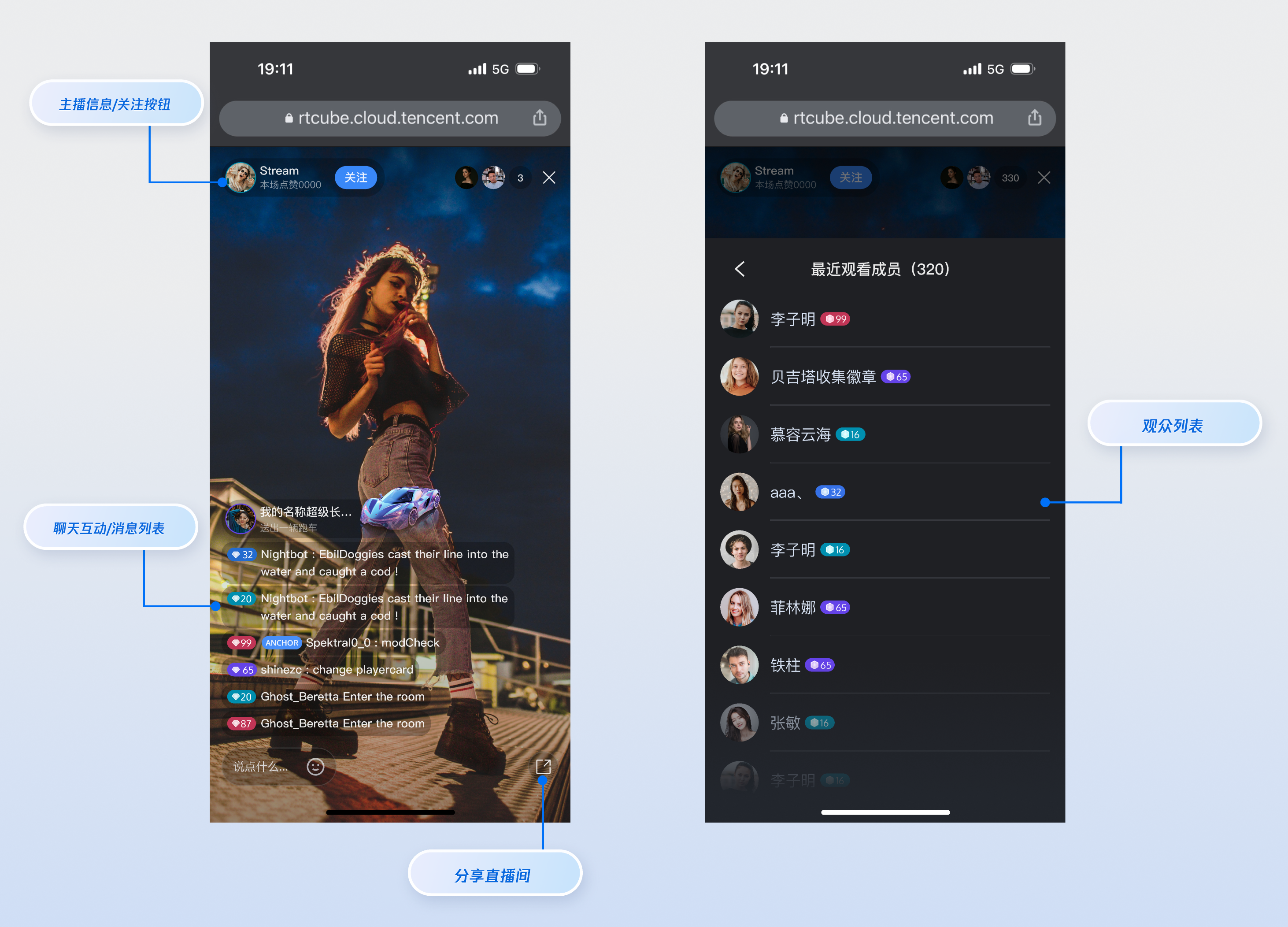消息列表 | 自定义消息弹幕区域展示 | 支持: 展示/隐藏聊天输入区域 支持 UI 定制聊天气泡风格、定制观众等级等内容 |