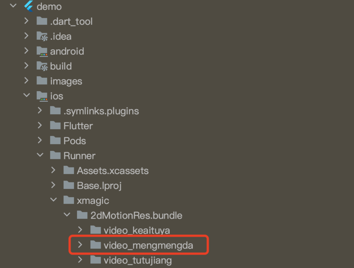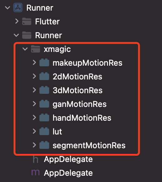 将 demo 工程中 ios/Runner 目录下的 xmagic 文件夹复制到您工程中 ios/Runner 目录下,添加后如下图: