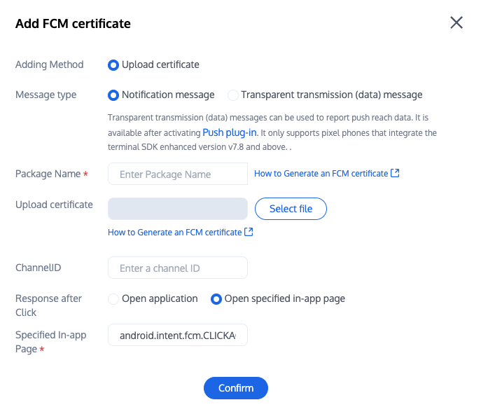 其余支持厂商不需要配置,FCM 暂不支持推送统计功能。