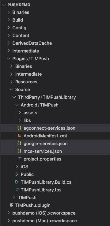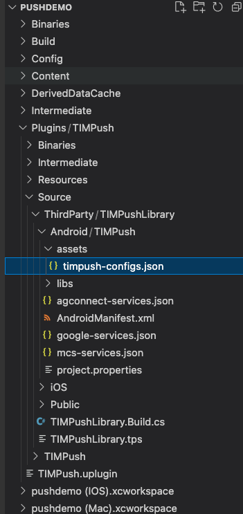timpush-configs.json 文件添加到 TIMPush 的 Source/ThirdParty/TIMPushLibrary/Android/TIMPush/Assets 目录下。下载配置文件 | 拷贝路径 |
