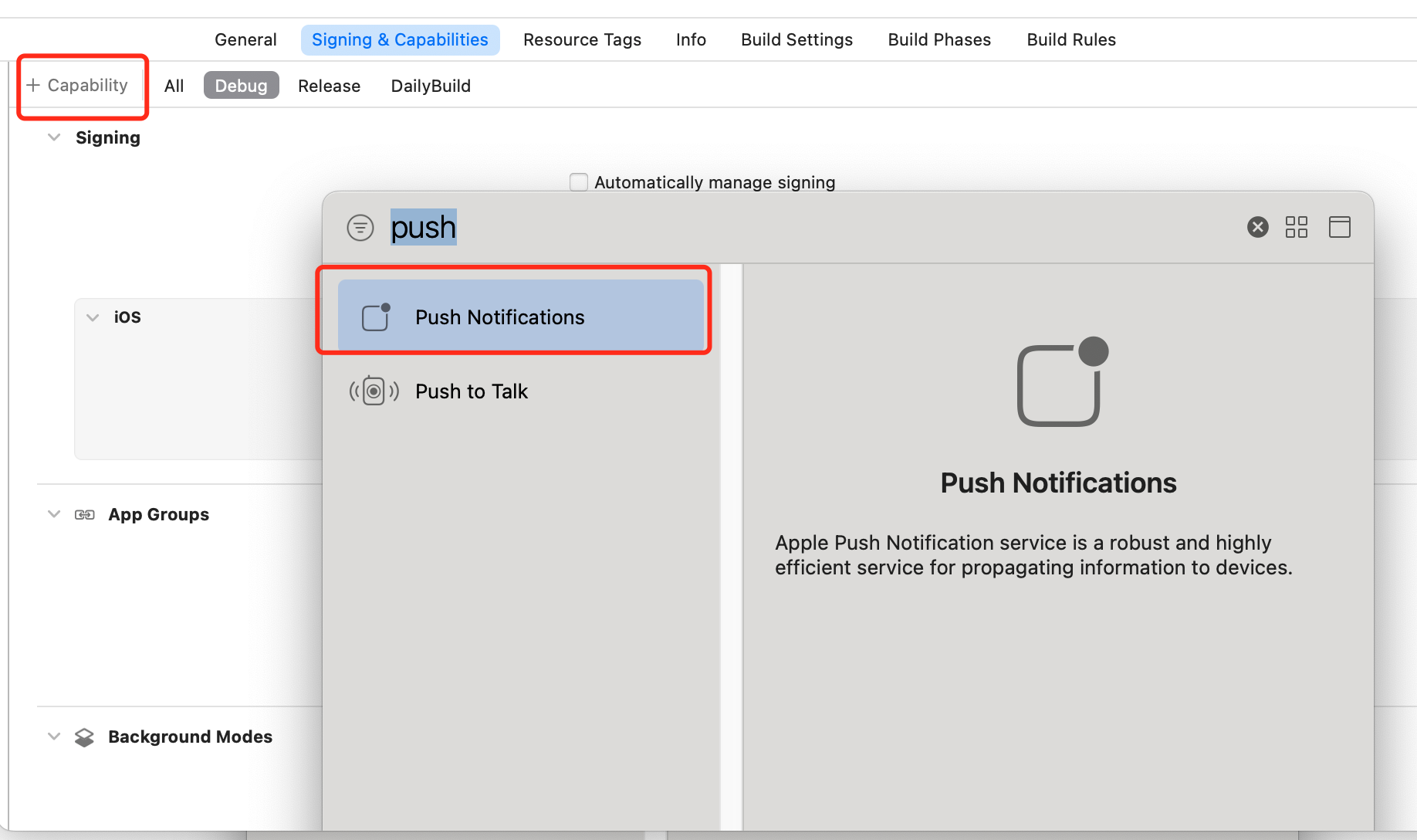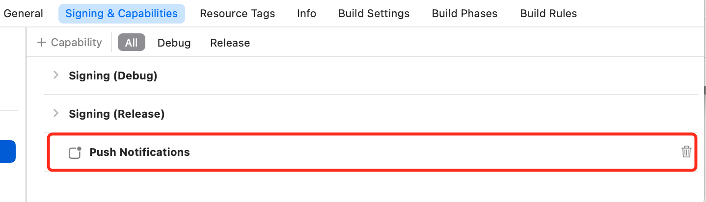 完成证书 ID 配置之后,您需要开启应用的 Push Notifications 能力:
