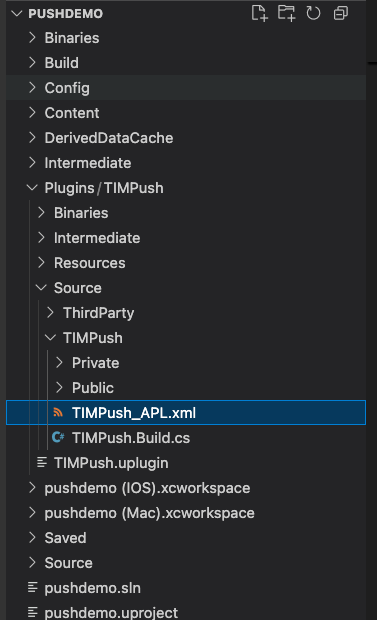 APL 相关配置 TIMPush 已配置好,只需要替换成应用自己的配置信息即可。TIMPush_APL.xml 路径在: /Plugins/TIMPush/Source/TIMPush/