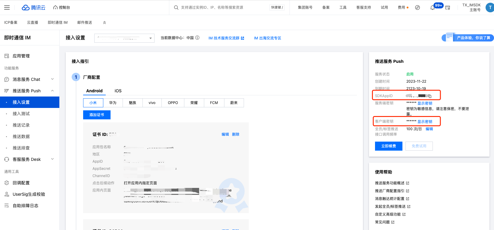 注册推送服务,请正确传递 sdkAppId 和 appKey 两个参数,即可注册推送服务。
