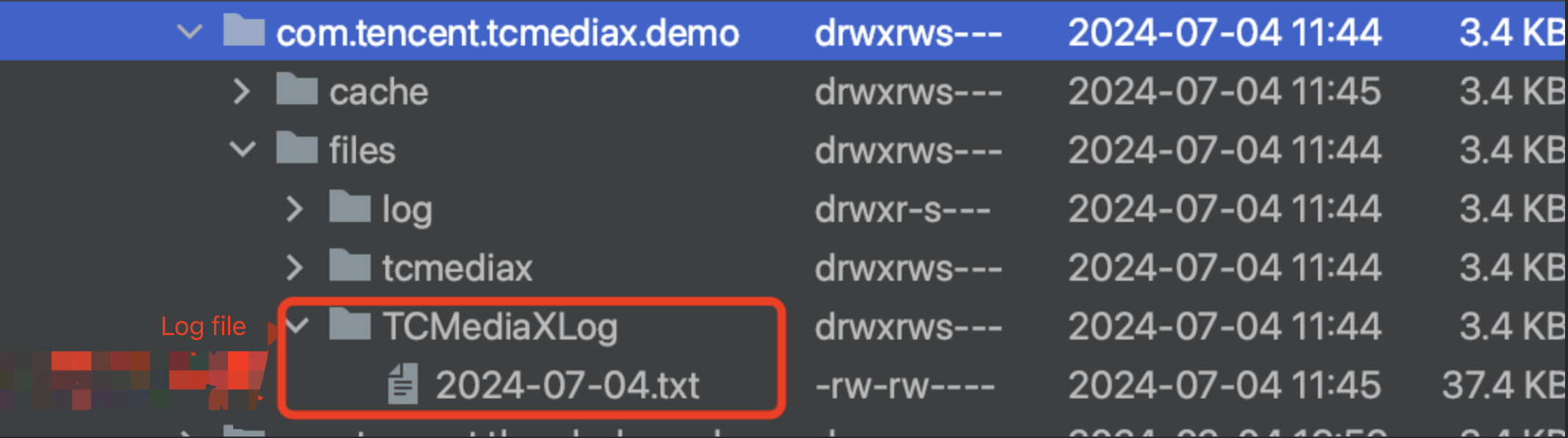 /sdcard/Android/data/${your_packagename}/files/TCMediaLog,日志文件按照日期命名,把 TCMediaLog 文件夹导出即可: