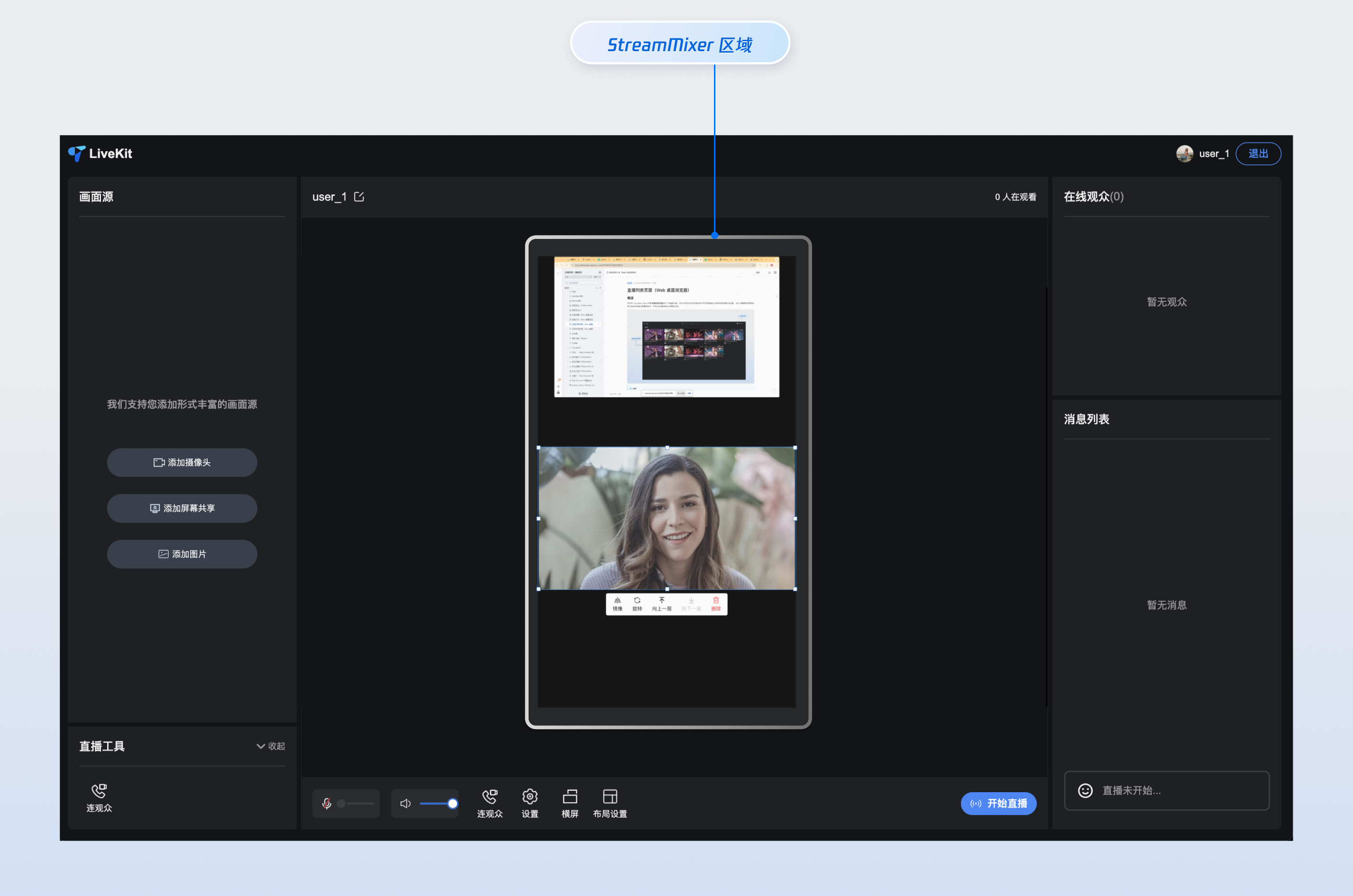 实时预览 | 提供所见即所得的编辑体验,主播可以直观地看到混流效果,支持对元素进行旋转、移动、缩放、镜像、层级调整等操作 |