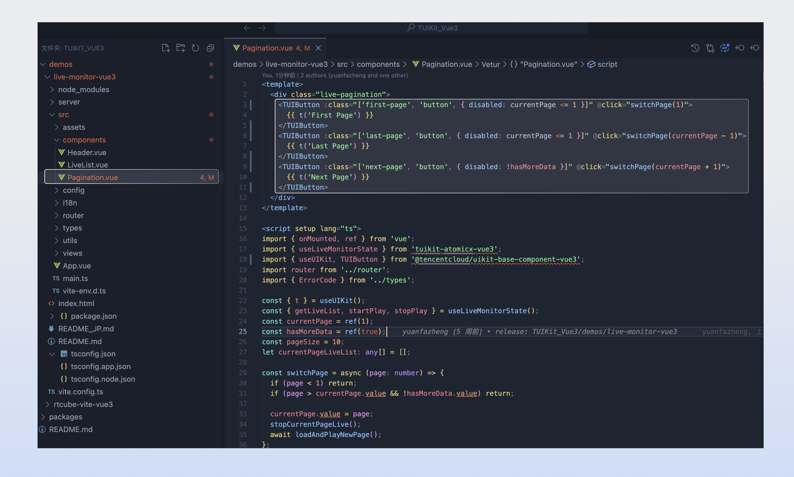 // cd TUIKit_Vue3/demos/live-monitor-vue3/src/views/live-monitor.vue<template><UIKitProvider language="zh-CN" theme="dark"><div class="live-monitor"><Header /><LiveList /><Pagination class="live-pagination" /></div></UIKitProvider></template><script setup lang="ts">import { useLiveMonitorState } from 'tuikit-atomicx-vue3';import { UIKitProvider } from '@tencentcloud/uikit-base-component-vue3';import { createBasicAccount } from '../config';import Header from '../components/Header.vue';import LiveList from '../components/LiveList.vue';import Pagination from '../components/Pagination.vue';const account = createBasicAccount();const { init } = useLiveMonitorState();if (account) {init({baseUrl: 'http://localhost:9000/api', // 步骤4 中服务端默认访问地址account: {sdkAppId: 0, // 您 TUILiveKit 服务的SDKAppIDuserId: '',// 该用户在 步骤1 中的 userIdpassword: '',// 该用户在 步骤1 中的 userSig},});}</script>