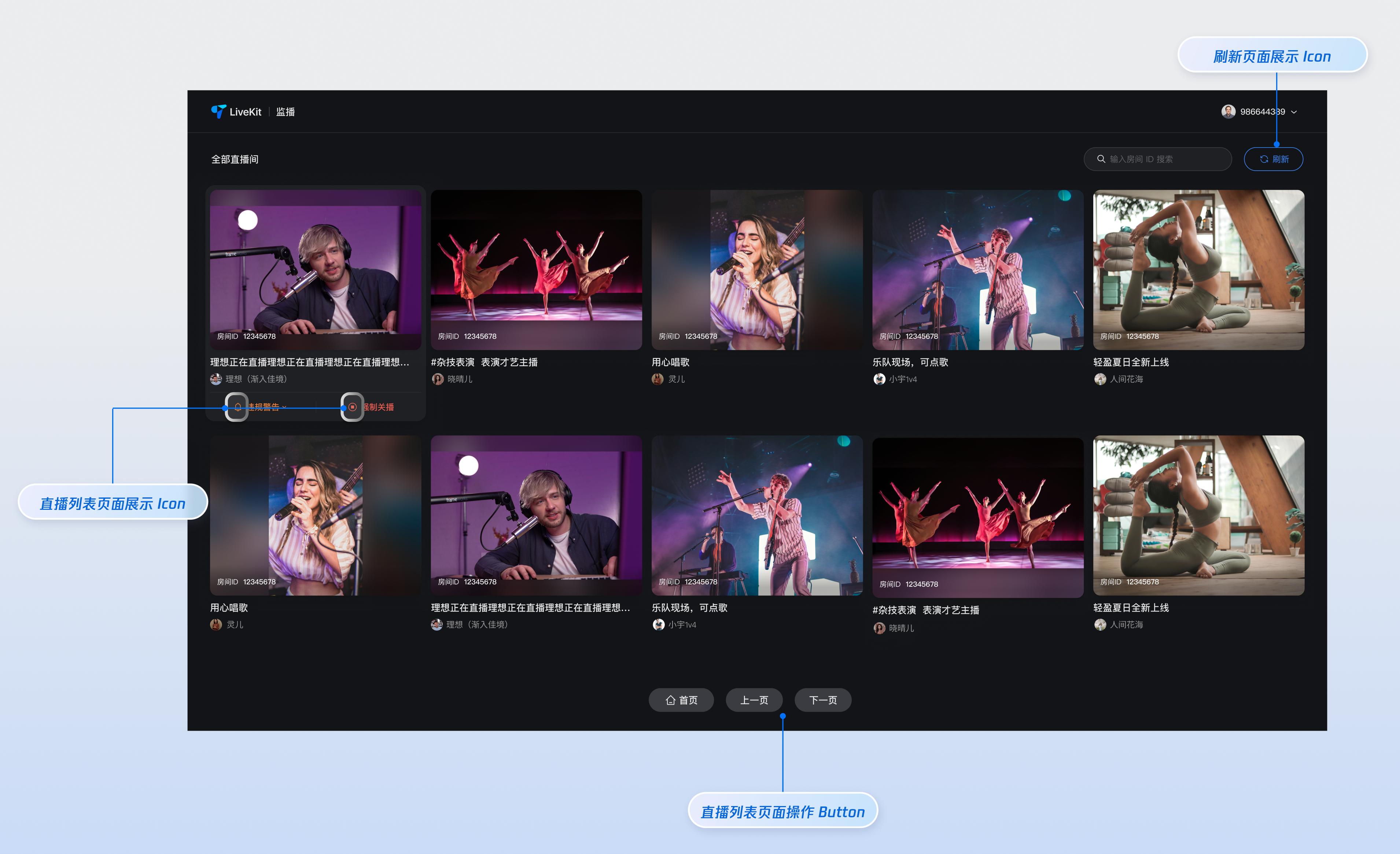 监播页面提供默认行为和风格,但如果默认行为和样式不能完全满足您的需求,您也可以对 UI 进行自定义。其中主要包含直播多路直播间同屏监播、低延迟播放、独立音频控制、一键查看详情、一键解散违规直播间等。