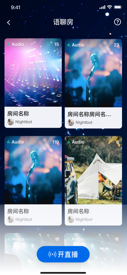 双列瀑布流:默认以双列卡片形式展示语聊房列表。