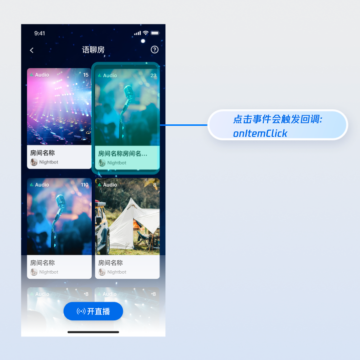 OnItemClickListener 回调处理点击事件,您只需在直播列表瀑布流视图中实现 OnItemClickListener 来响应用户的点击事件,并在 onItemClick 中实现跳转进入观众观看页的功能,观众观看页实现可参考 观众观看 。交互示例:
