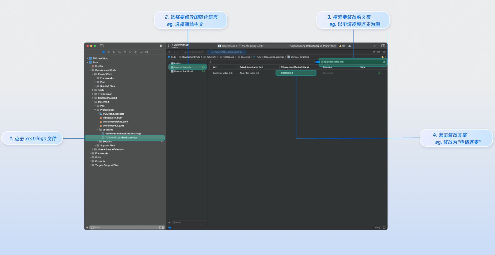 TUILiveKit.xcassets 管理 UI 所需的图片资源,您可以借助 Xcode 图形化工具快速替换图标。