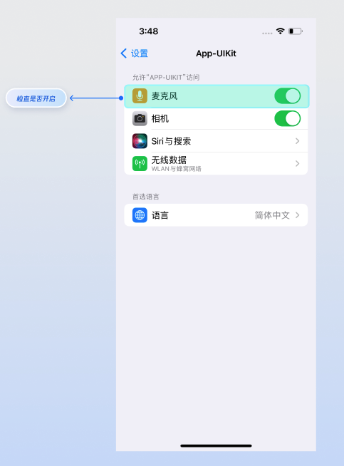 请前往手机设置>App>麦克风,检查麦克风权限是否开启。