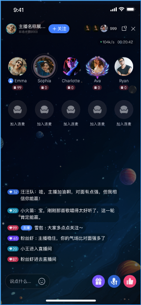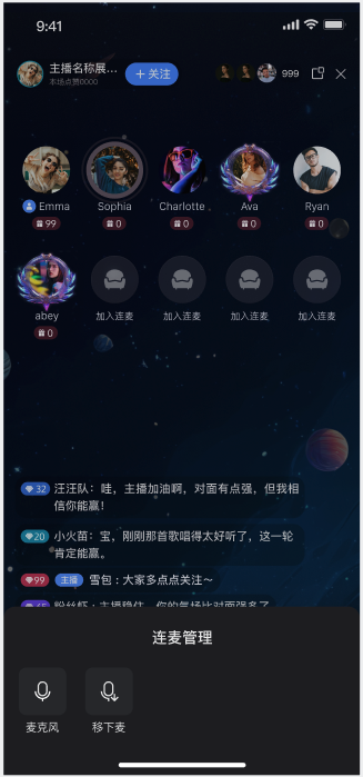 上麦互动: 申请上麦,与主播进行音频连麦互动。