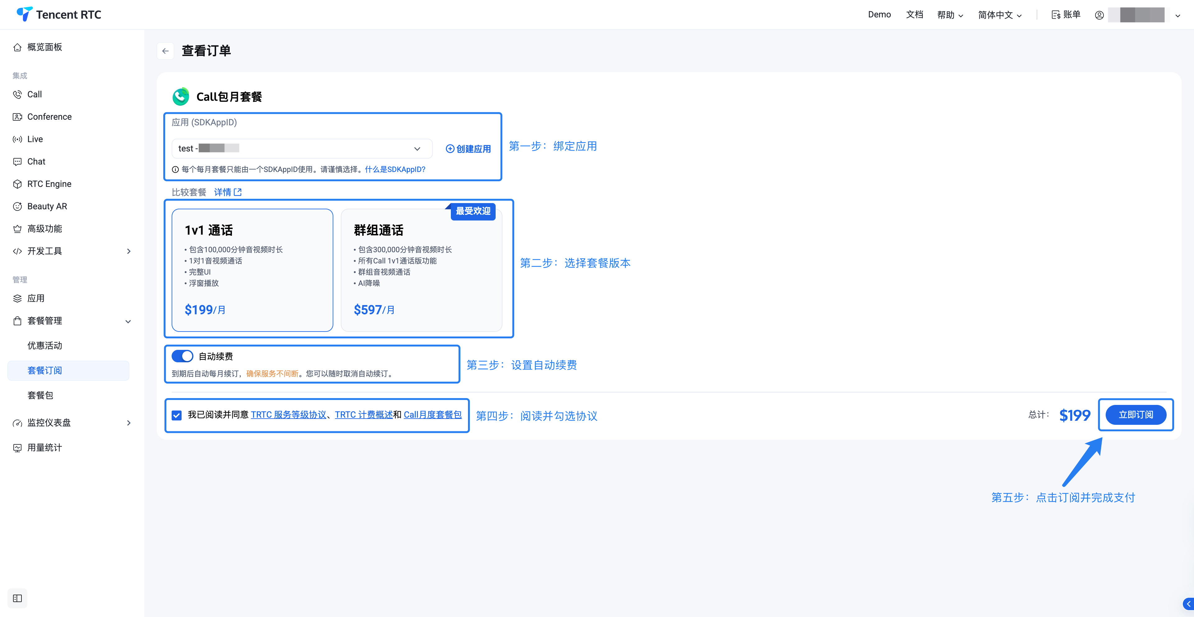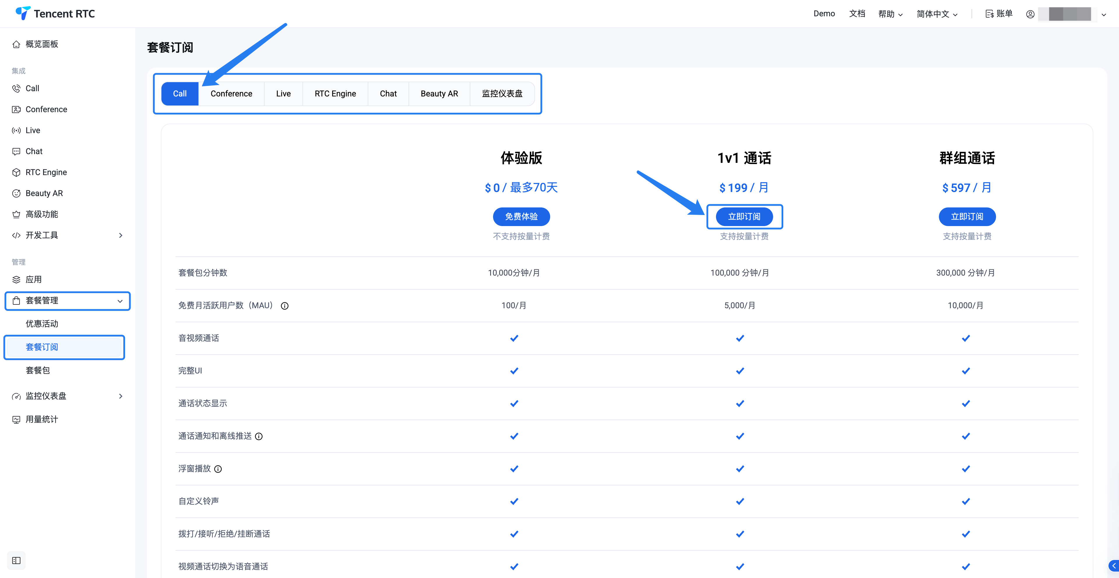 1. 进入套餐订阅页面:登录 Tencent RTC 控制台 后,通过左侧导航进入套餐管理 > 套餐订阅页面。选择您要购买的产品及其版本,点击版本下方的立即订阅 ,进入订单页面。