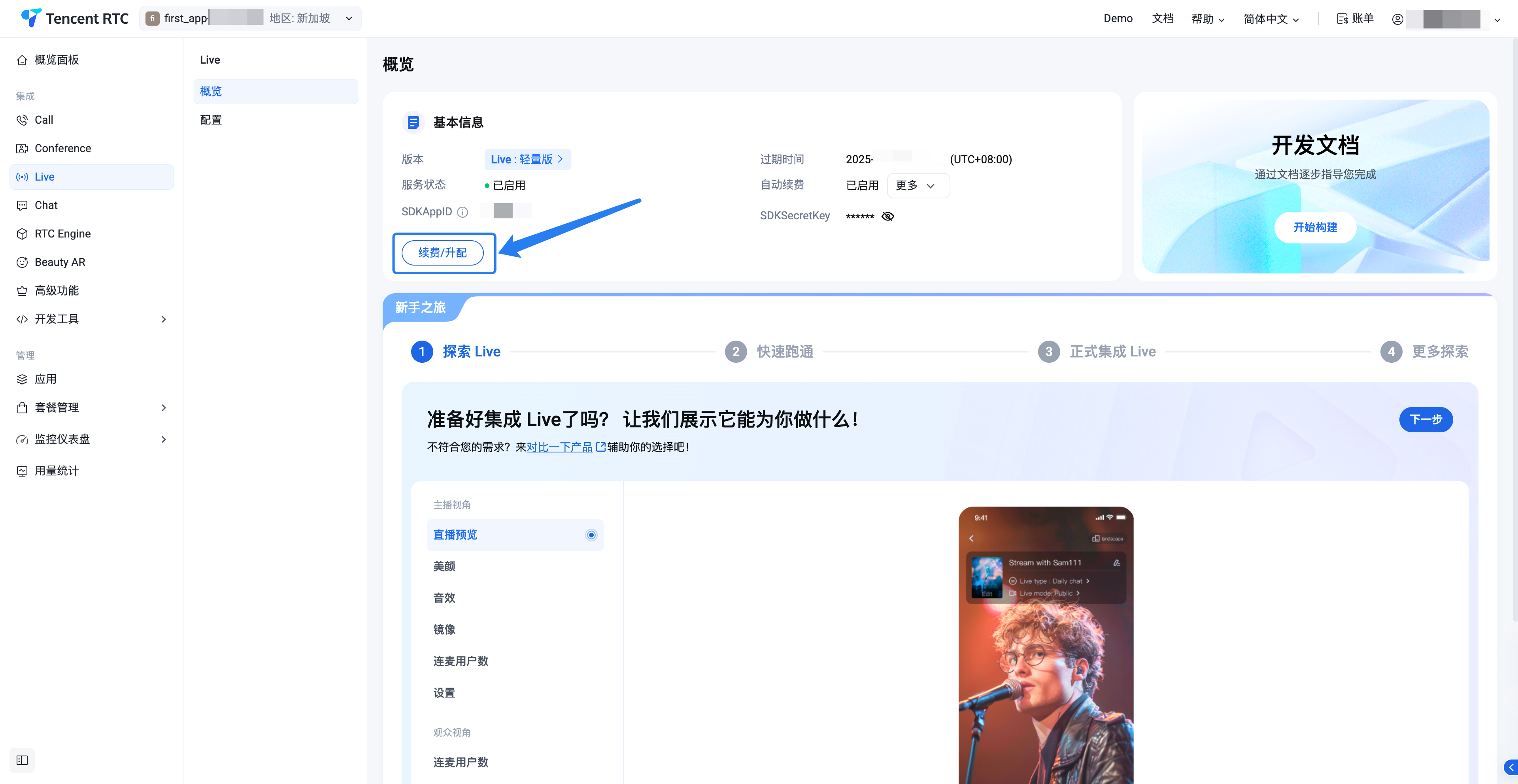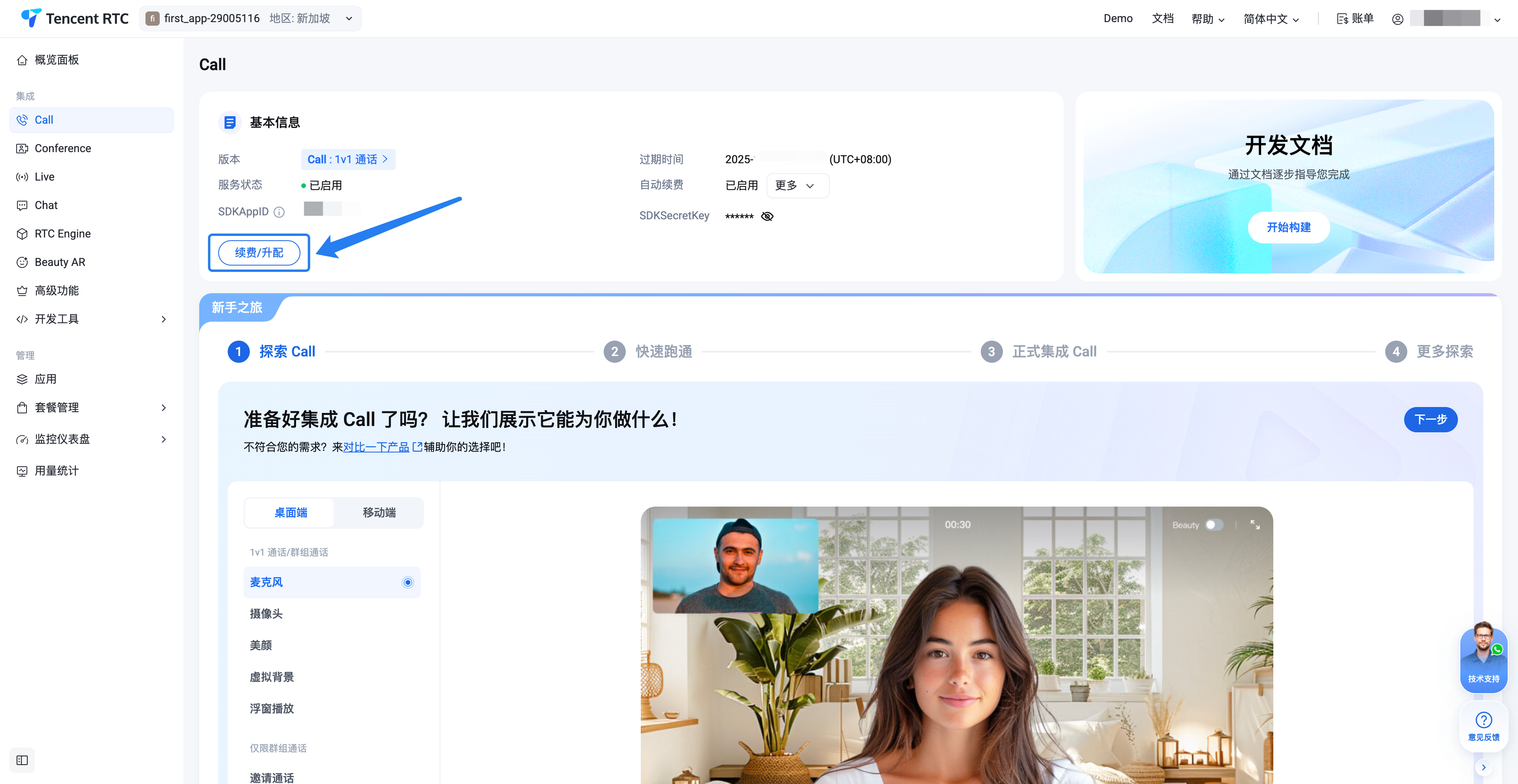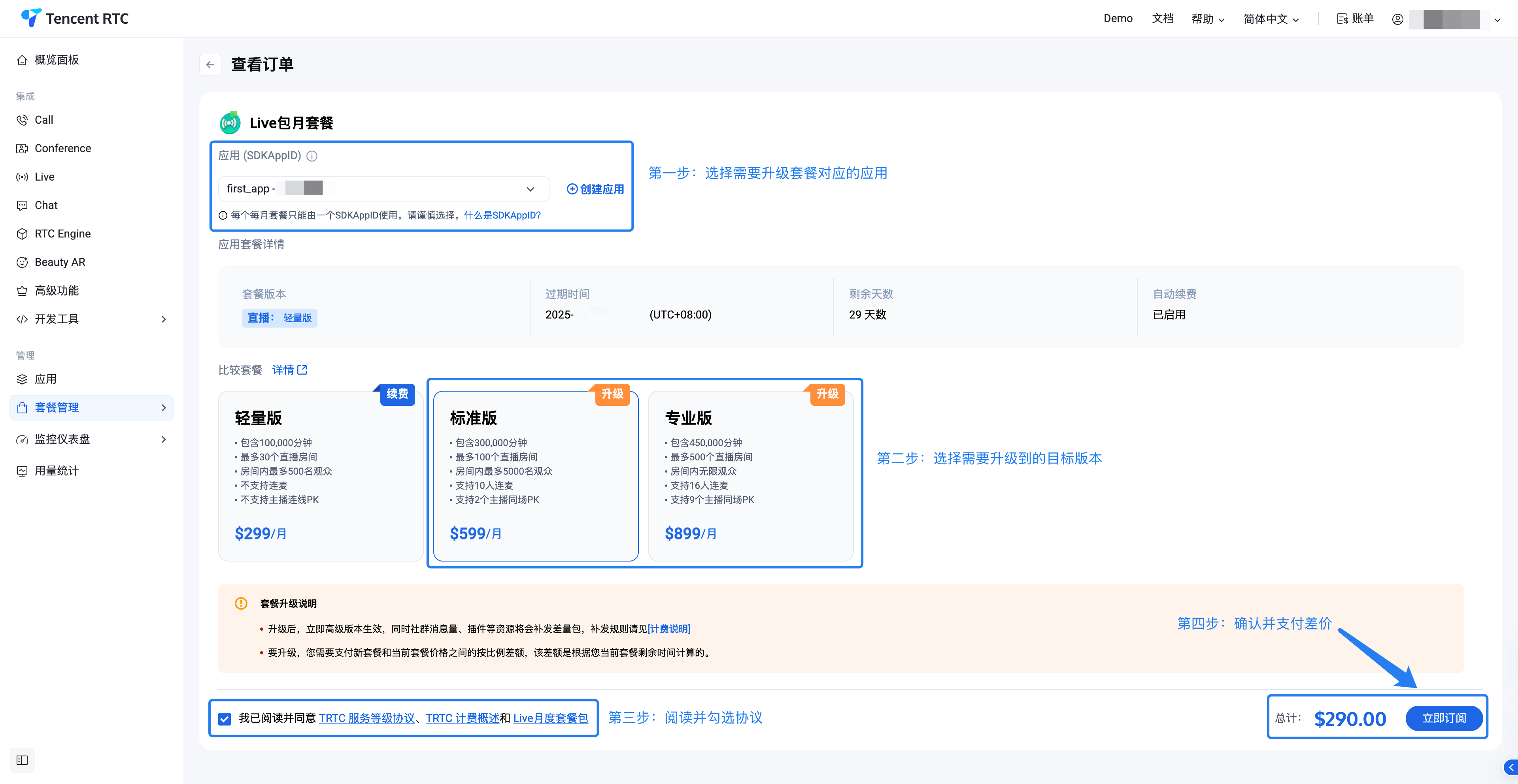 限制范围:仅限于 TRTC 相关产品套餐(Call、Live、Conference、RTC Engine)和 Chat 的套餐。Beauty AR 相关套餐暂不支持升级,如有需要请联系我们。