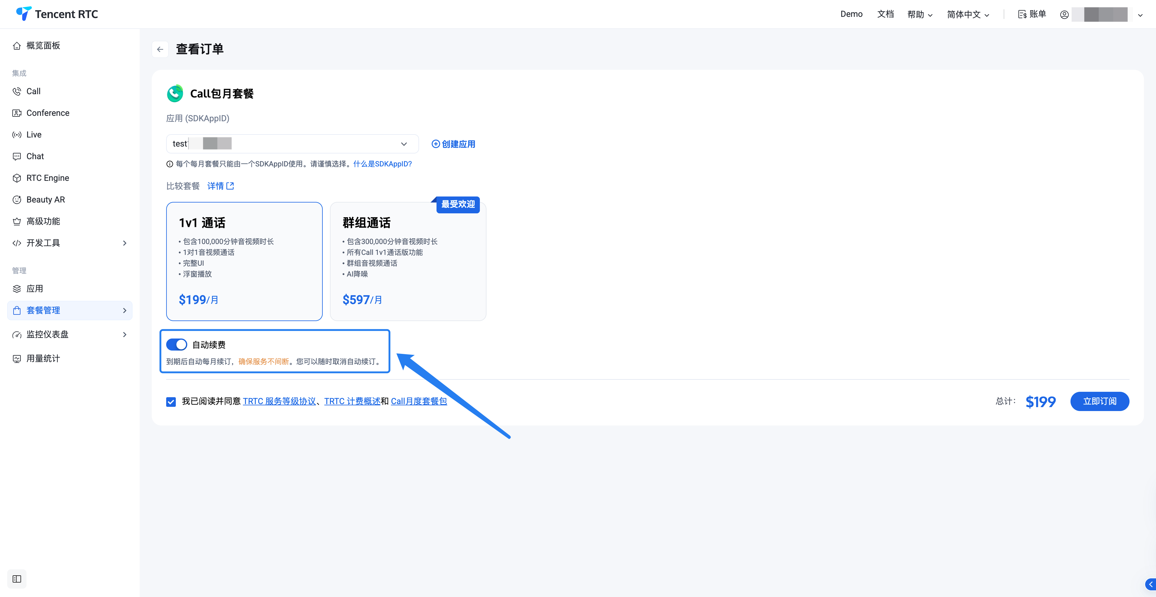 购买套餐时开启:在套餐购买页下单时,即可选择开启自动续费。开启后,套餐包到期前将自动续订次月的服务,确保服务不间断。您可以随时取消自动续订。