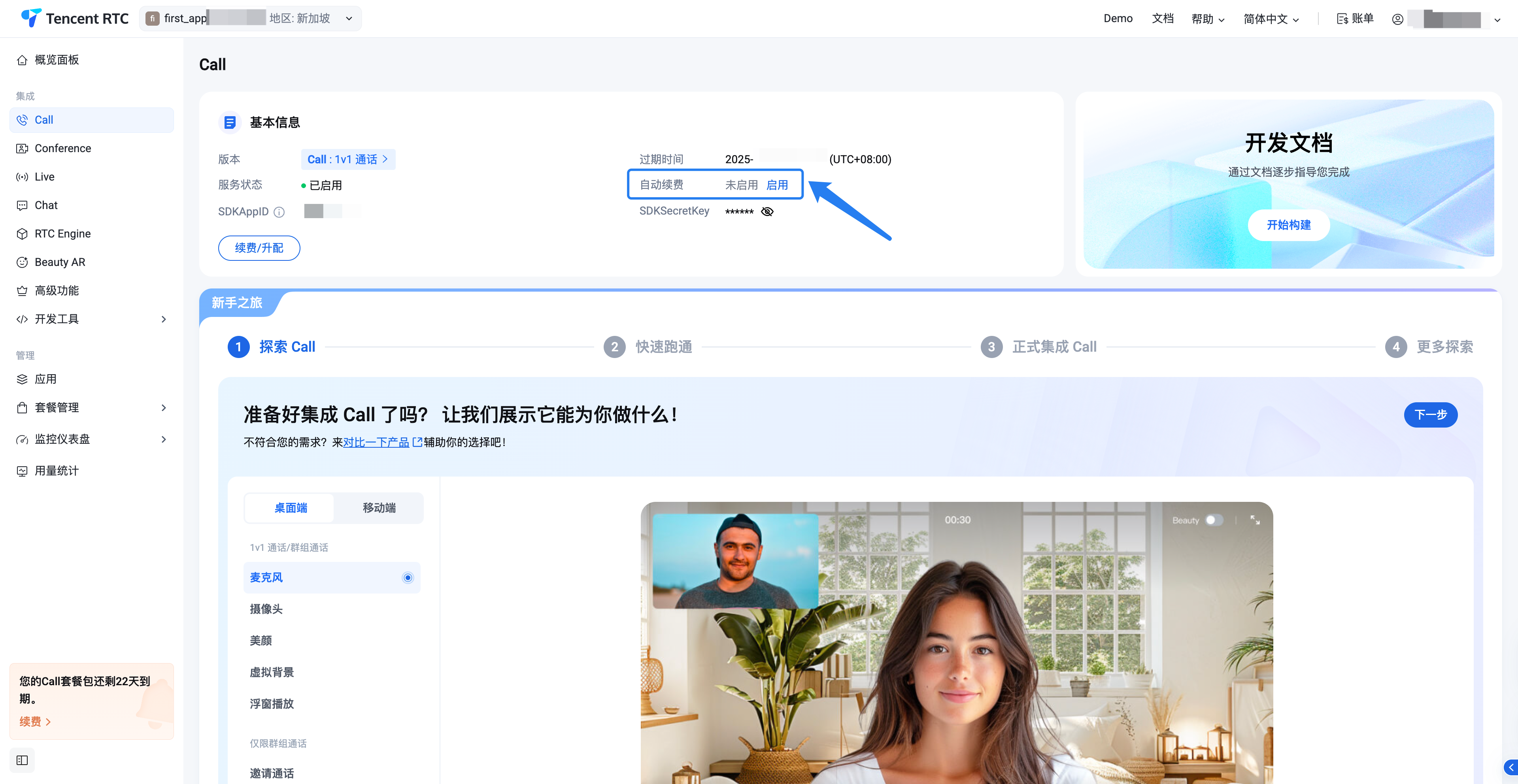 购买套餐后开启:如果您在购买套餐时没有开启自动续费,仍可通过控制台开启。登录控制台后,通过左侧导航栏选择您要开通自动续费的产品(如果同一产品有多个套餐包,可在左上角切换应用)。在应用信息卡片中找到自动续费,点击启用即可。