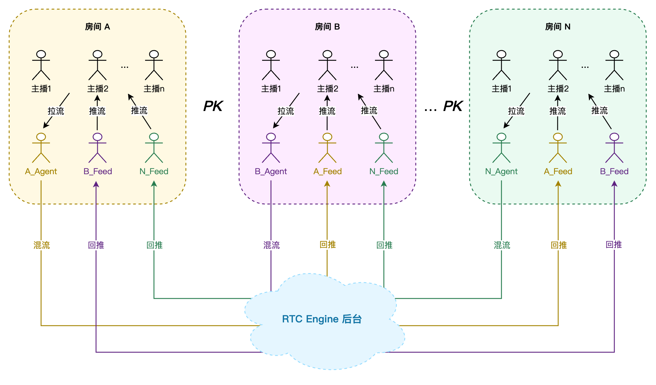 4. 房间 A、房间 B、房间 N 的用户互相拉取房间中混流回推的音视频流,开始进行跨房 PK。