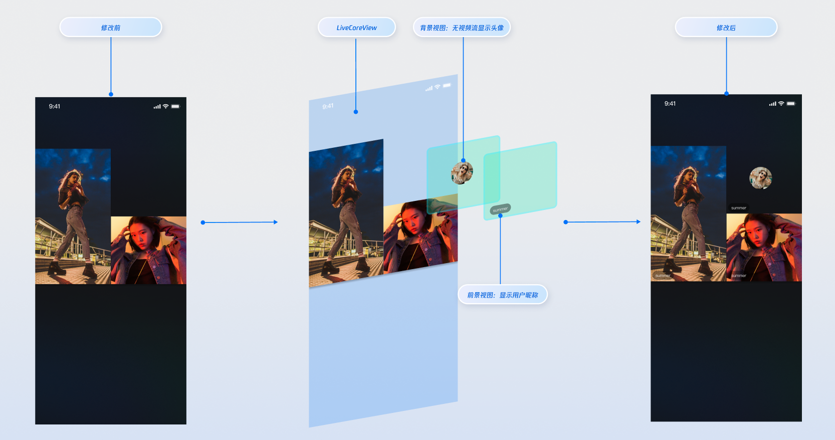 LiveCoreView.VideoViewDelegate 协议提供的“插槽”能力,在观众连麦的视频流画面上添加自定义视图,用于显示昵称、头像等信息,或在他们关闭摄像头时提供占位图,以优化视觉体验。实现视频流画面的昵称显示