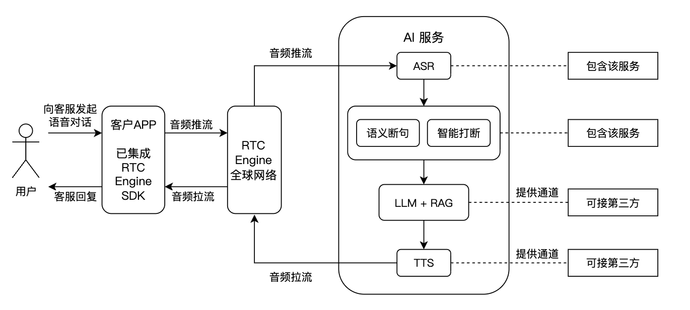 智能语音客服是一种利用人工智能和语音识别技术来实现自动化交互和问题解决的客户服务系统。在 AI 大模型出现之前,智能客服主要利用自然语言处理和机器学习算法来理解客户的意图,依赖于预设的规则和知识库来进行问题解答。随着 LLM 的发展,越来越多的智能客服接入了大模型的能力,LLM 技术使智能语音客服能够更好地理解对话的上下文,从而实现连贯的对话交流。
