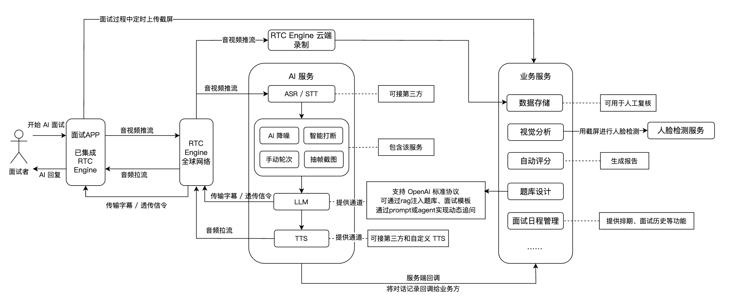 AI 面试是一种利用人工智能技术和高质量实时音视频通信实现在线自动化面试的新型方案。在传统面试过程中,受限于面试官数量、时间安排和主观评价等因素,企业在大规模招聘、人才筛选环节容易遇到效率低、成本高、体验不佳的问题。借助 AI 实时对话能力,AI 面试可以为企业和求职者提供24小时可用、标准化且高效的在线面试体验。AI 面试官基于大语言模型(LLM),能够与应聘者进行自然对话,实时提问、追问,考察应聘者的综合能力,并根据面试内容自动记录和整理文本数据,为后续评估提供支持。
