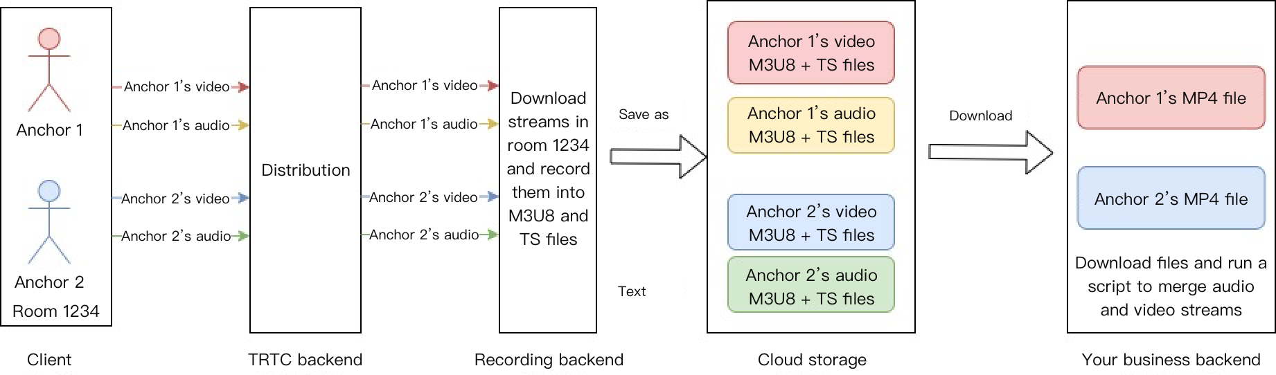 混流录制:将同一个房间的音频媒体流混流录制成一个文件。