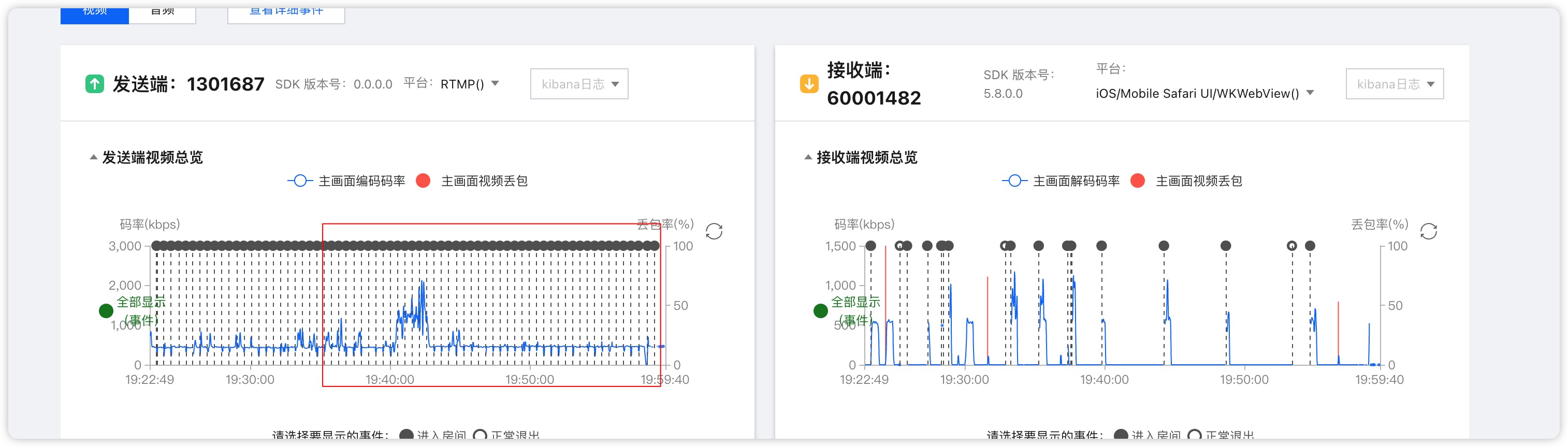 在娃娃机场景中,当 RTC Engine 观众进入房间并拉流一段时间后,便会自动遇到拉流卡住问题,尤其在多次触发 peer-join 或 onUserVideoAvailable 回调后,观众拉流的画面会停留在最后一帧不动。遇到这种情况时,可以首先访问仪表盘查看详细的通话信息。如果仪表盘显示的特征表明主播多次进出房间,那么可以基本确认问题是由于互踢导致的,仪表盘特征如下。