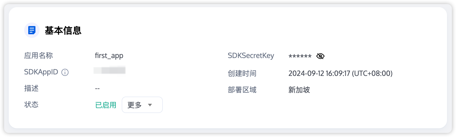 2. 应用创建完毕之后,您可以在 应用 > 应用概览中看到该应用的基本信息,其中需要您保管好 SDKAppIDSDKSecretKey 便于后续使用,同时应避免密钥泄露造成流量盗刷。
