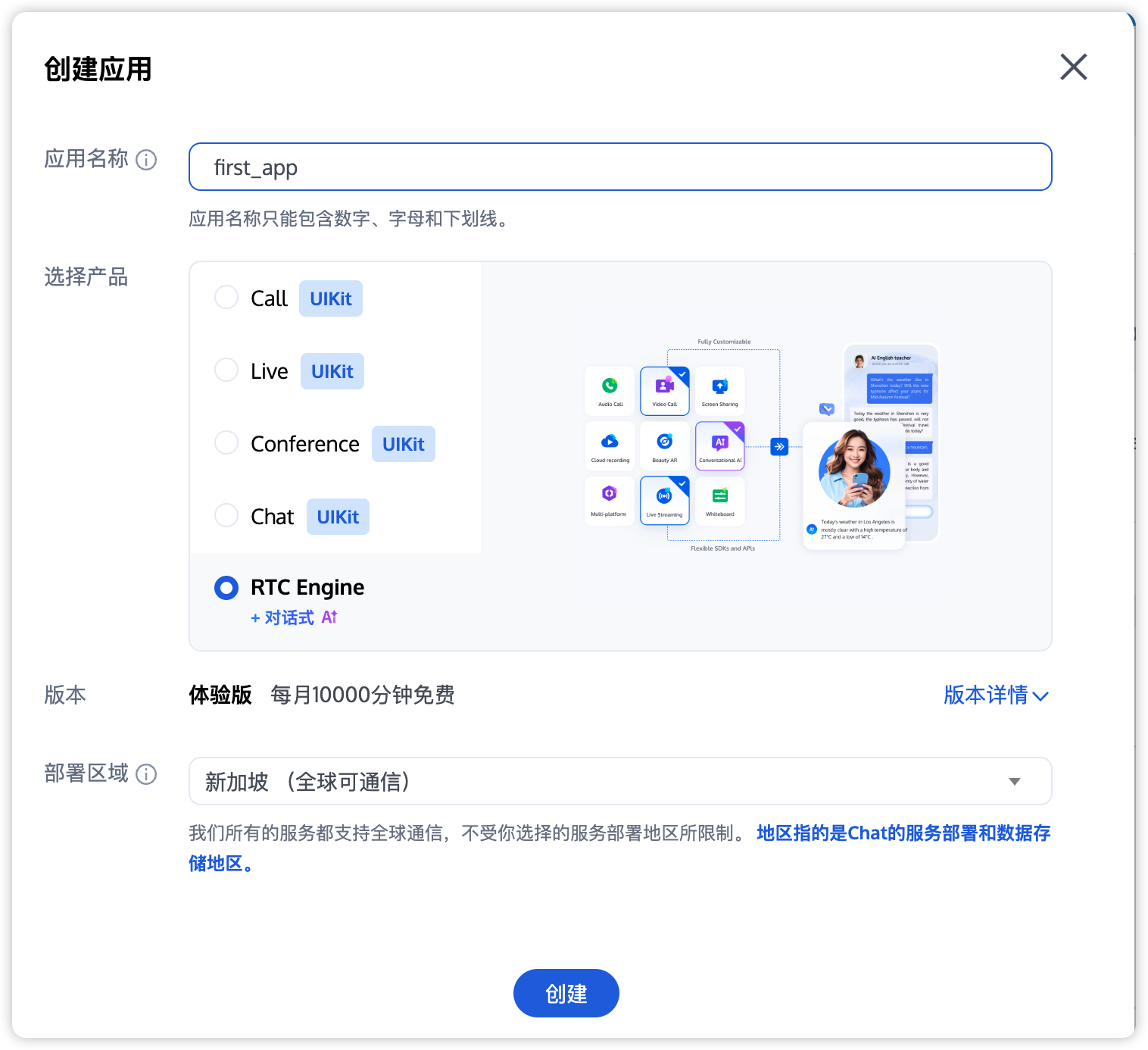 建议创建两个应用分别用于测试环境和生产环境,首次开通 RTC Engine 服务有免费 10000 分钟试用时长包。