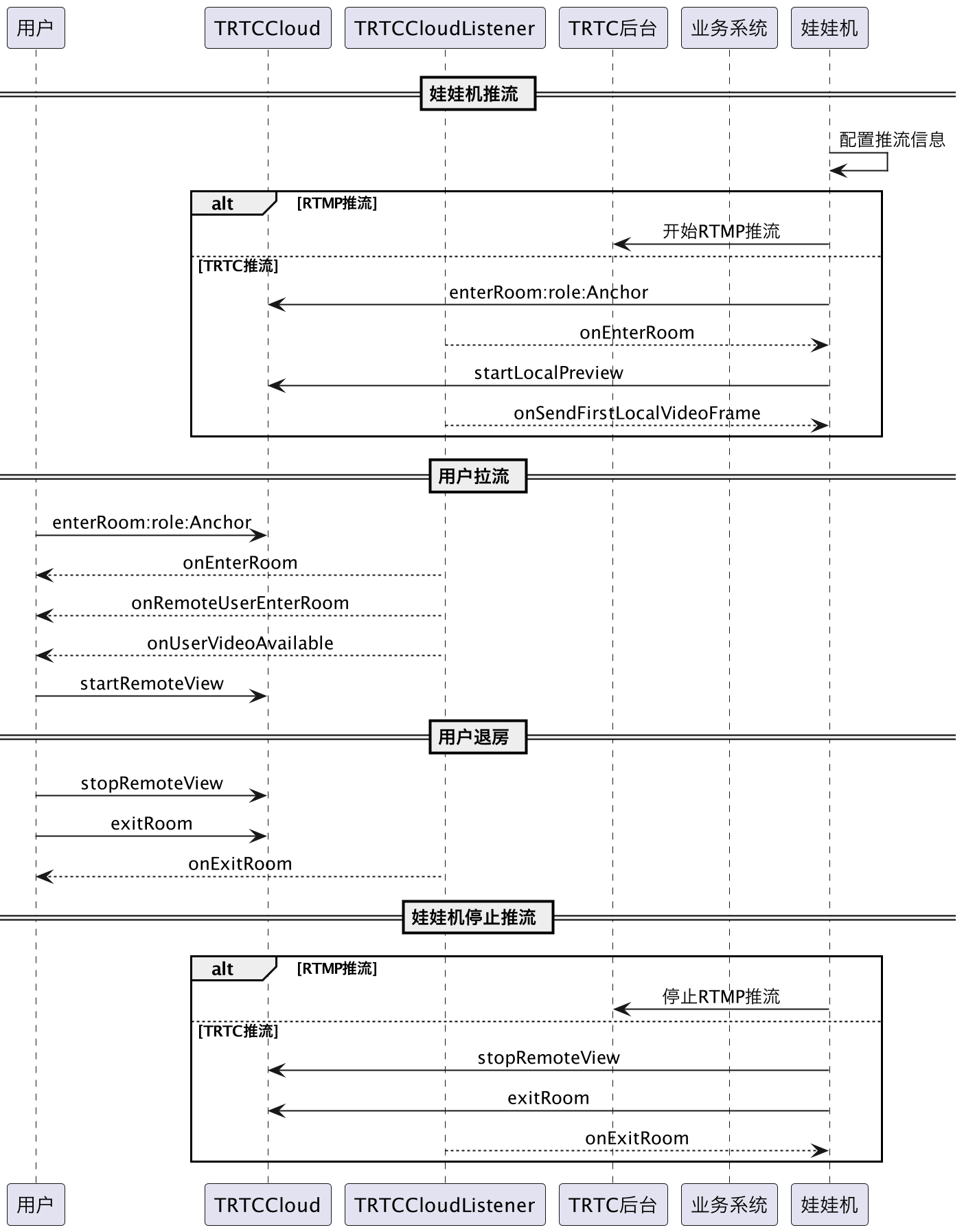 下图展示了在线娃娃机 RTC Engine 推流的序列图,其中包含网络摄像头 RTC Engine 推流、用户拉流等流程。