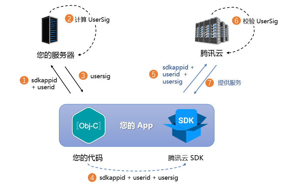 5. SDK 将 SDKAppID + UserID + UserSig 提交给腾讯云服务器进行校验。
