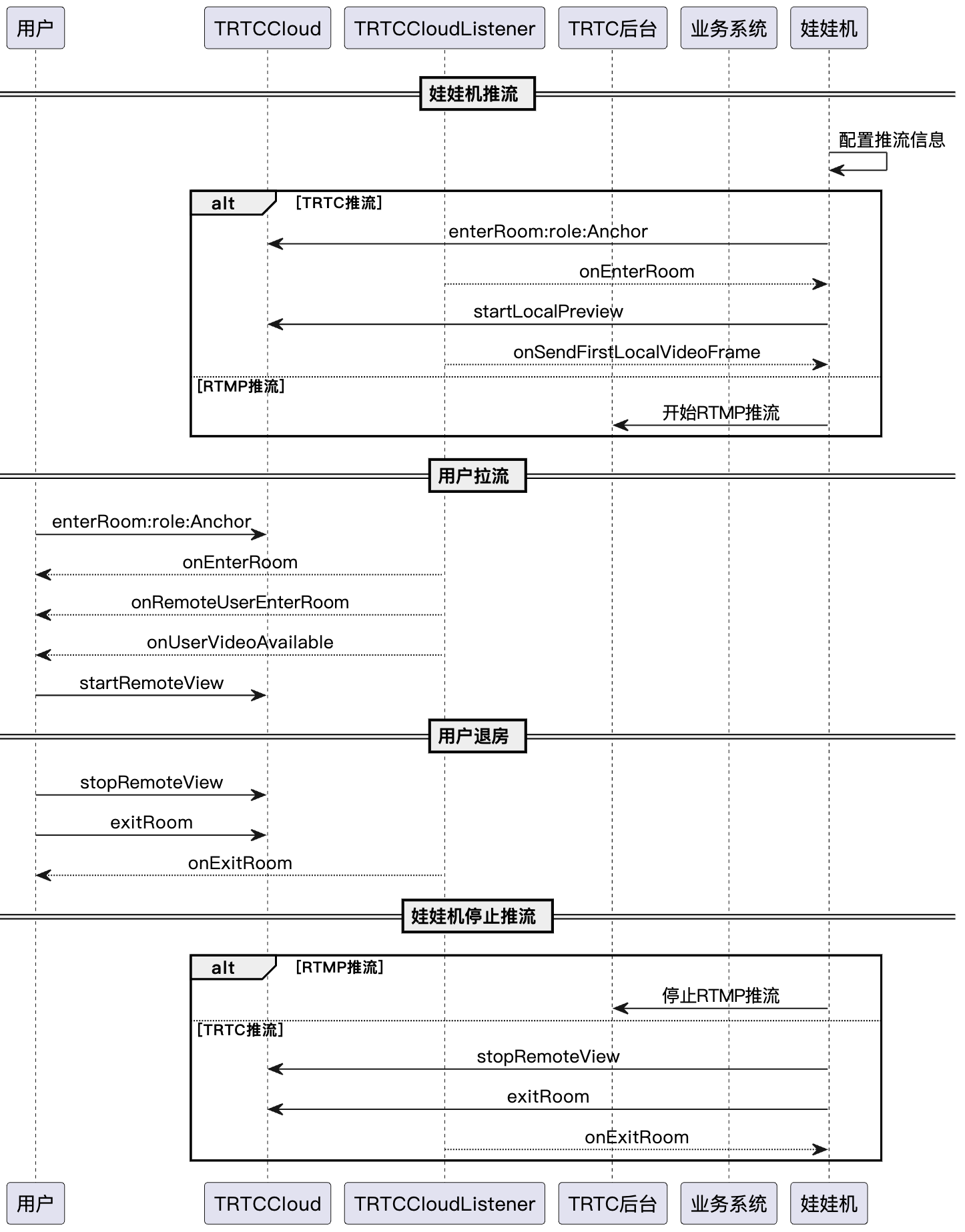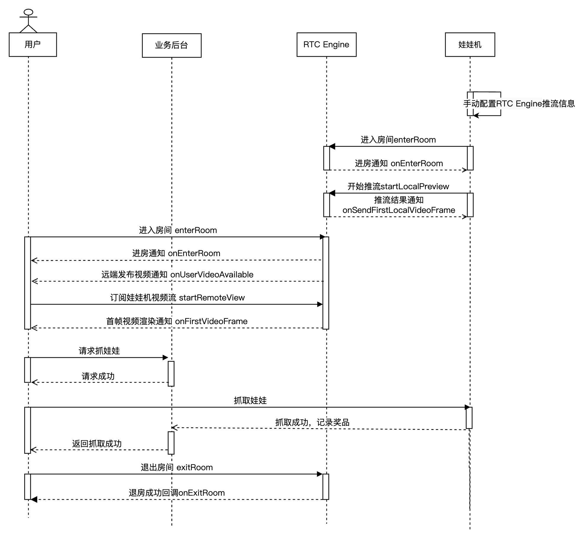 下图展示了在线娃娃机 RTC Engine 推流的序列图,其中包含网络摄像头 RTC Engine 推流、用户拉流等流程。