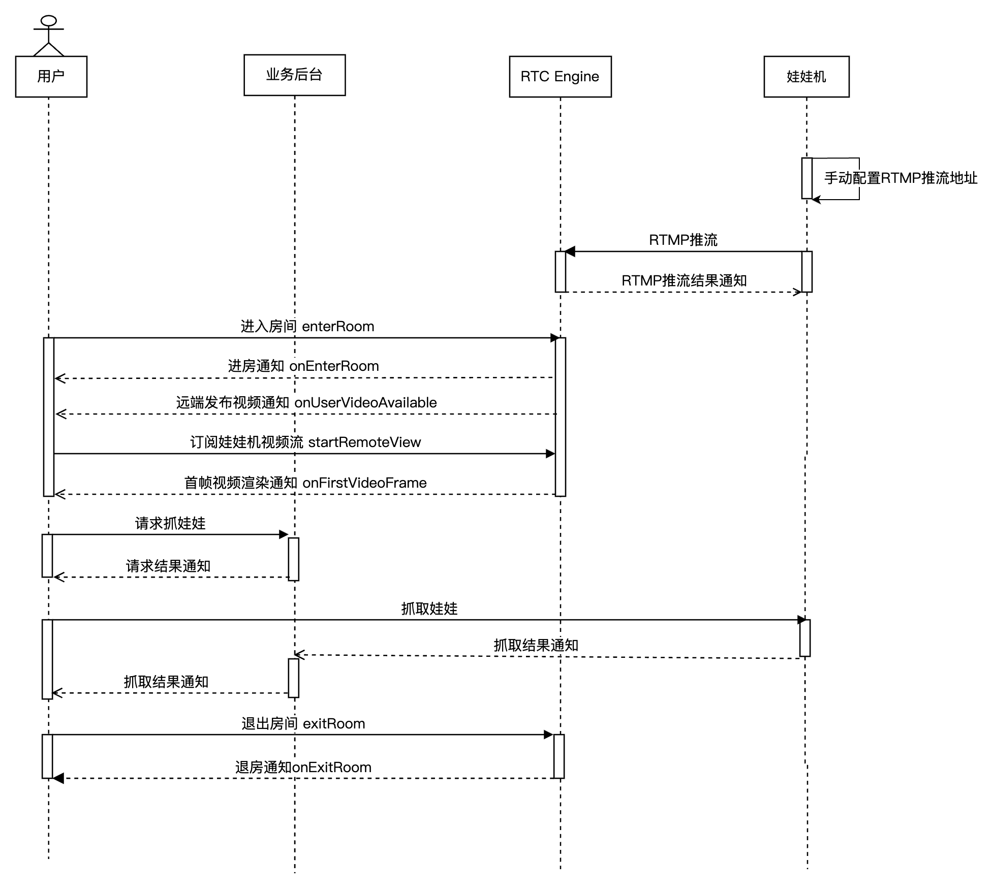 下图展示了在线娃娃机 RTMP 推流的序列图,其中包含网络摄像头 RTMP 推流、用户拉流等流程。