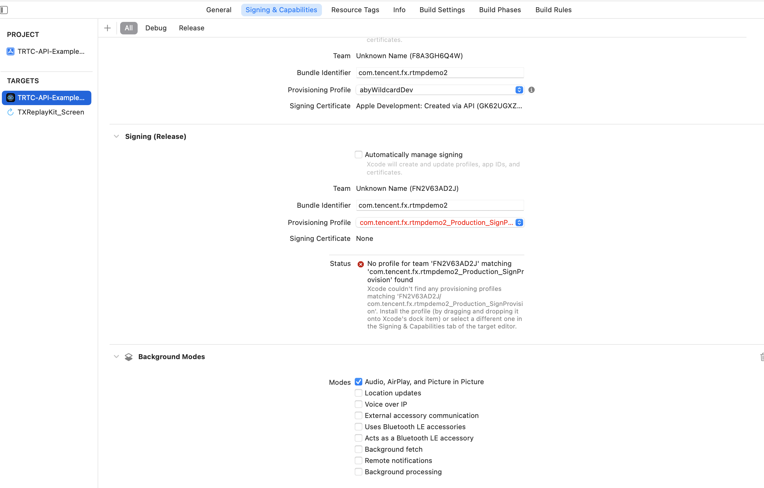 2. 如需 App 进入后台仍然运行相关功能,可在 XCode 中选中当前工程项目,并在 Capabilities 下将设置项 Background Modes 设定为 ON,并勾选 Audio,AirPlay and Picture in Picture ,如下图所示: