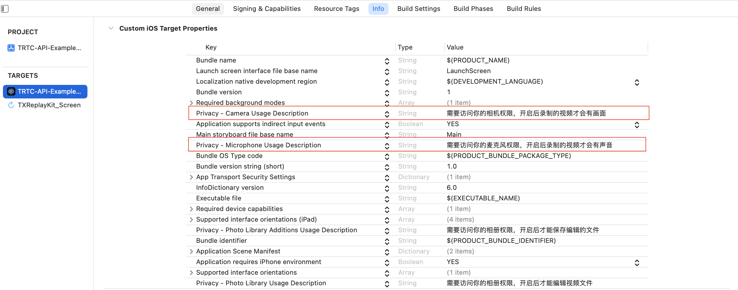 Privacy - Microphone Usage Description, 同时填入麦克风使用目的提示语
