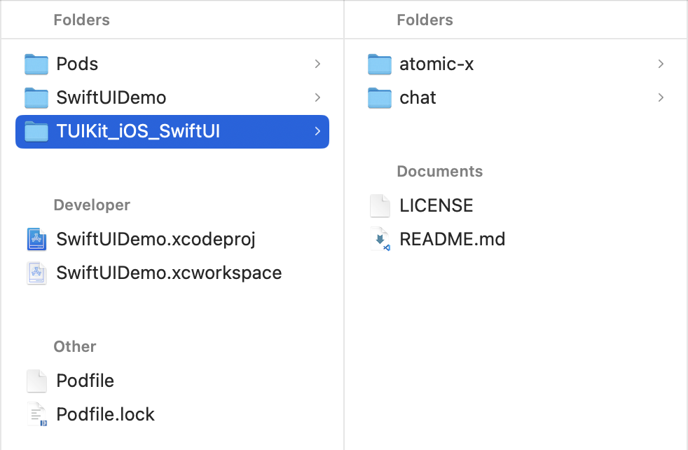 pod 'AtomicX/Chat', :path => './TUIKit_iOS_SwiftUI/atomic-x/AtomicX.podspec'TUIKit_iOS_SwiftUI 文件夹位于您工程 Podfile 文件子目录: