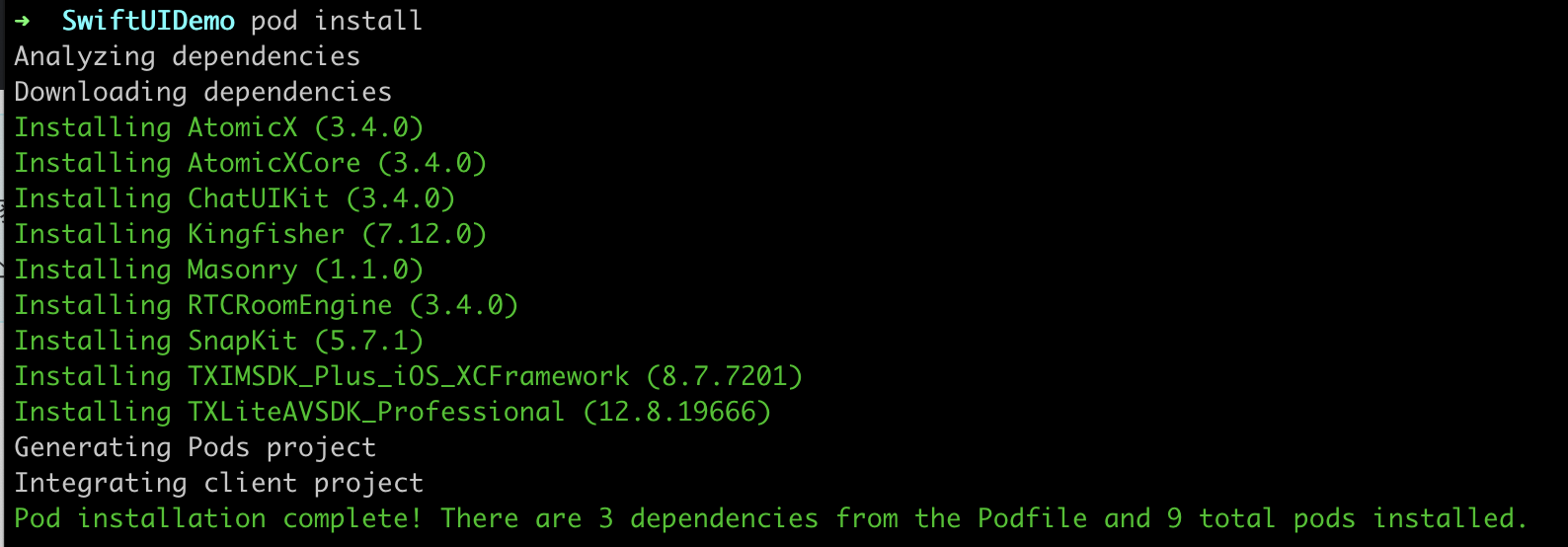 3. Podfile 修改完毕后,执行以下命令,安装本地 TUIKit SwiftUI 组件。示例: