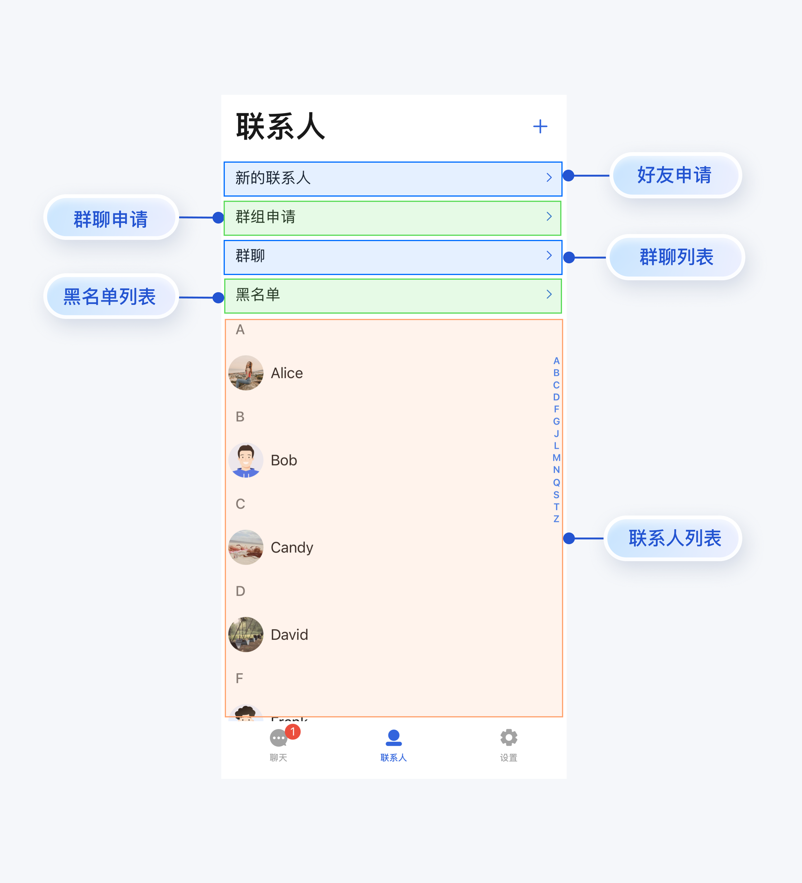 ContactList 上半部分预留了各个子视图的入口 cell,例如好友申请、群聊申请、群聊列表和黑名单列表。下半部分内嵌了联系人列表,如下图所示: