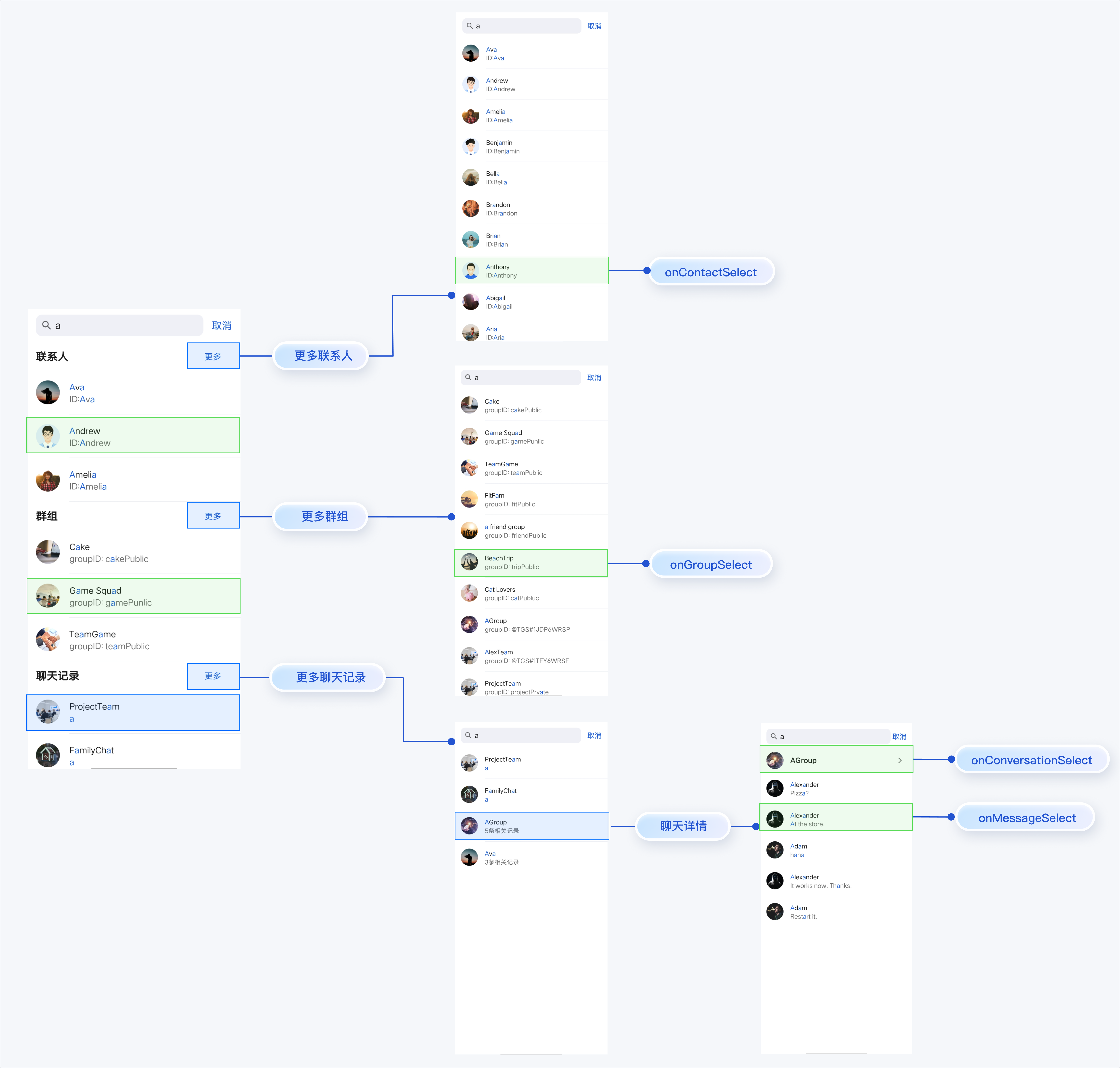 onContactSelect/onGroupSelect/onConversationSelect/onMessageSelect,需在回调中实现自定义跳转(例如跳转到您的自定义聊天界面)。如下图所示: